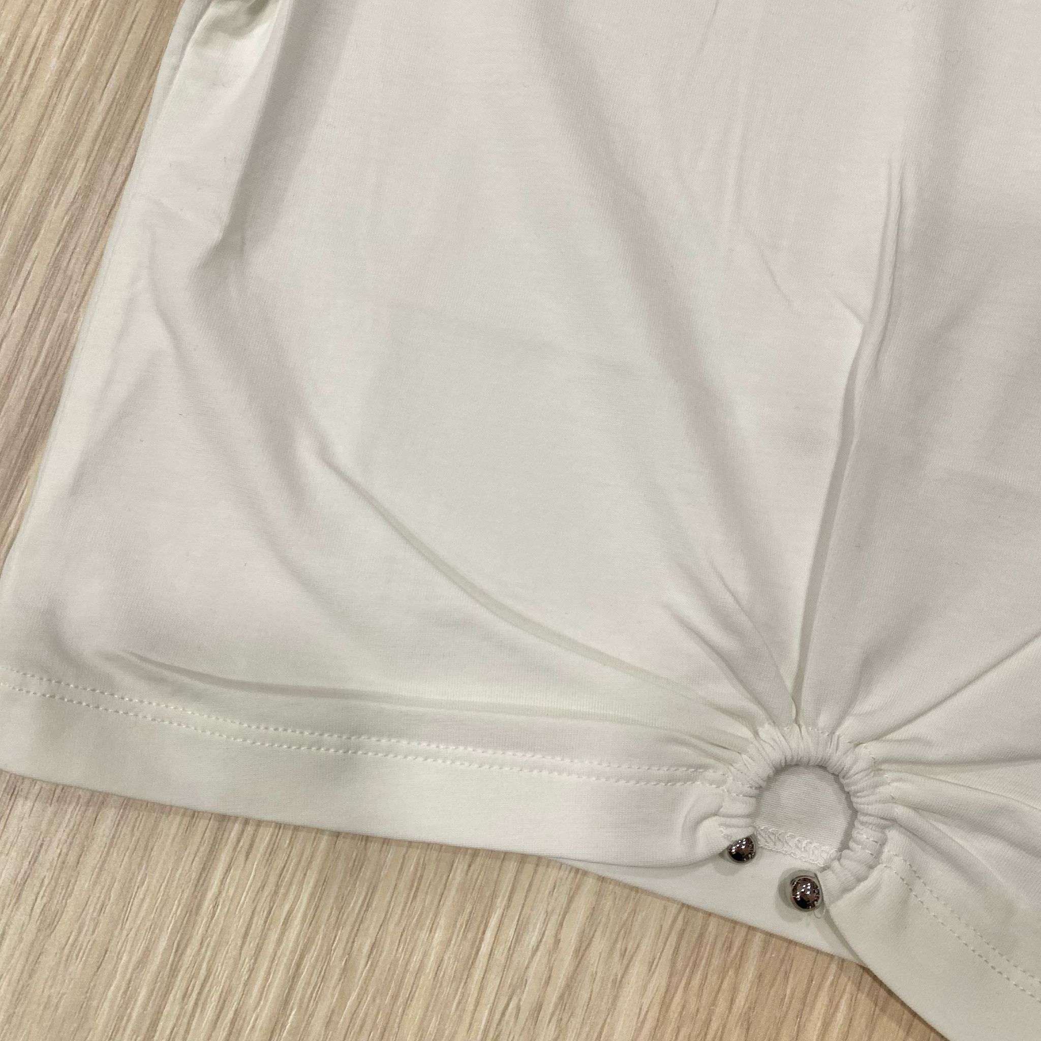T-shirt cropped bambina/ragazza in cotone, di colore bianco, con arricciatura a cerchio e applicazione di palline argentate punzonate. 95% Cotone. 5% Elastane.