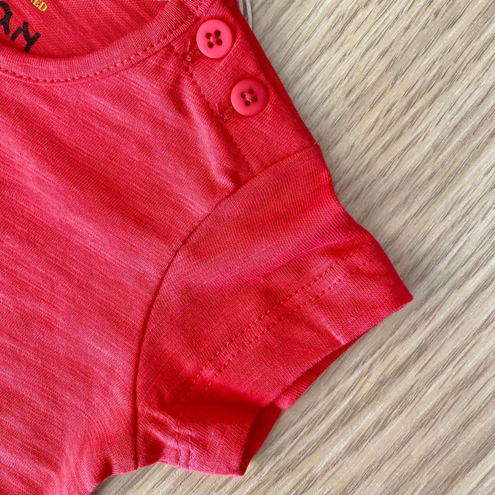 T-shirt neonata/bambina in cotone, di colore corallo, con dettaglio di cuoricino e scritta in rilievo. 100% Cotone.