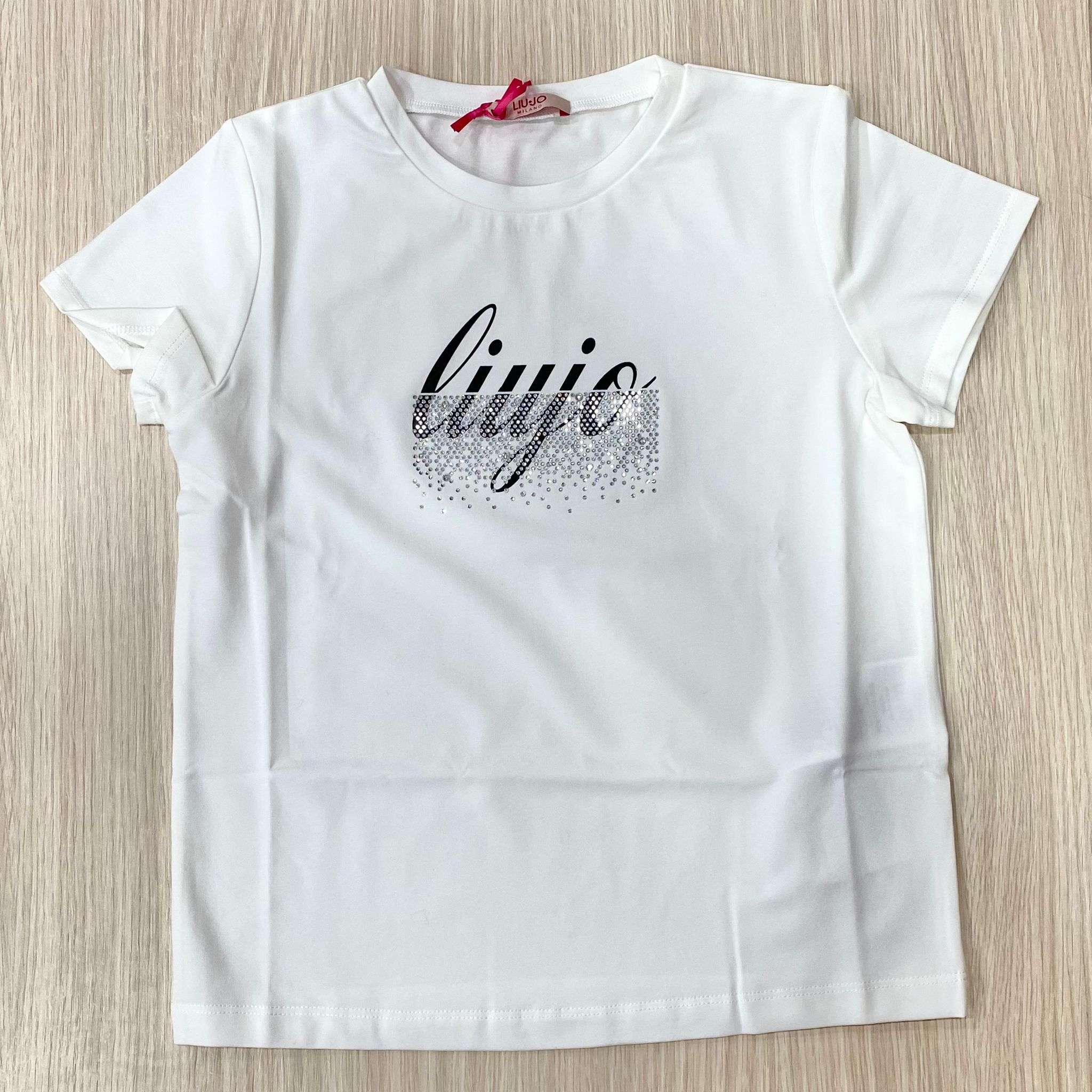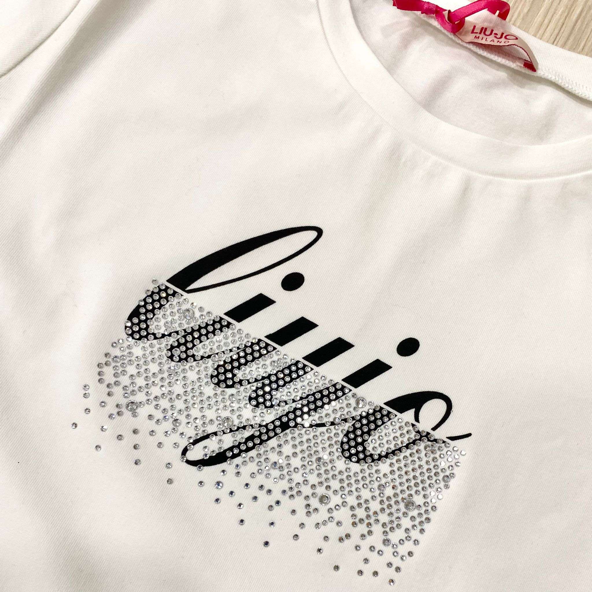T-hirt bambina/ragazza LIU JO di colore bianco in morbido cotone leggermente elasticizzato, con bellissimo logo in stampa nera abbellita da tantissimi swarovski. 95% cotone 5% elastan