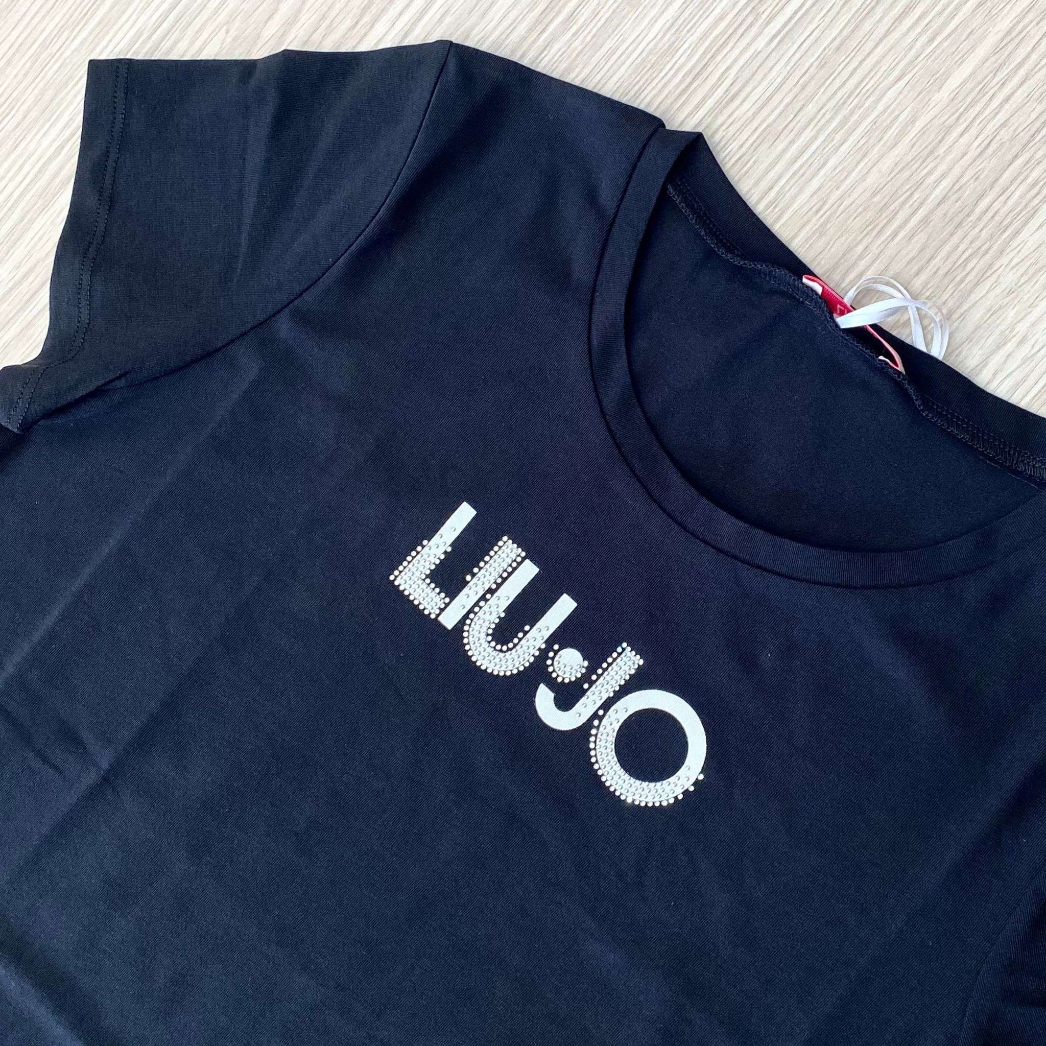 T-shirt bambina/ragazza LIU•JO in cotone di colore nero. Modello a maniche corte con girocollo e vestibilità confortevole. Sul davanti è presente la scritta LIU•JO con applicazioni di strass che aggiungono un tocco luminoso ed elegante. Un capo versatile e femminile, perfetto per completare look casual con stile.