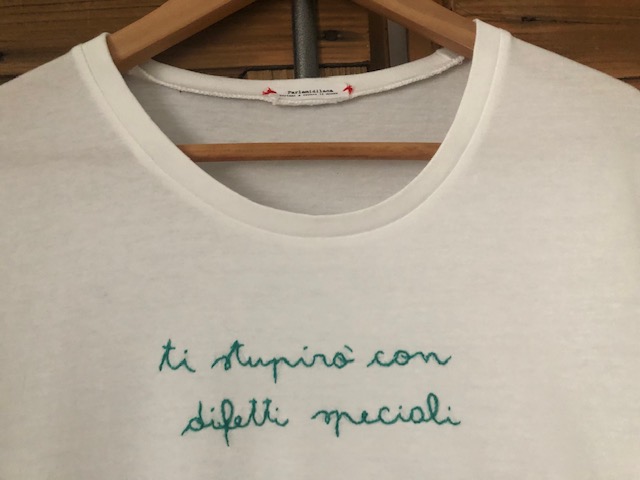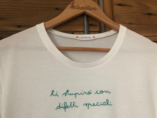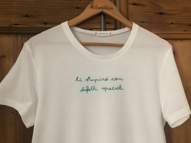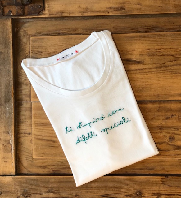 T-shirt “TI STUPIRO’ CON DIFETTI SPECIALI” ricamata a mano. La foto è puramente illustrativa, il modello utilizzato ora è quello in cotone BIO (vedi tabella TAGLIE in galleria foto)