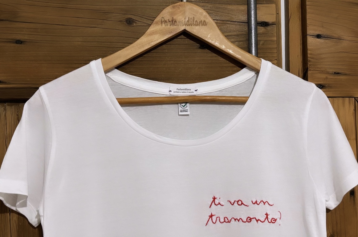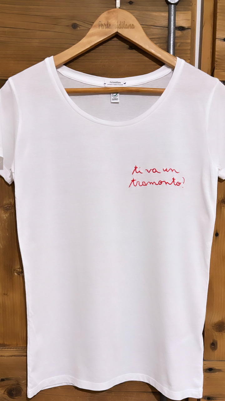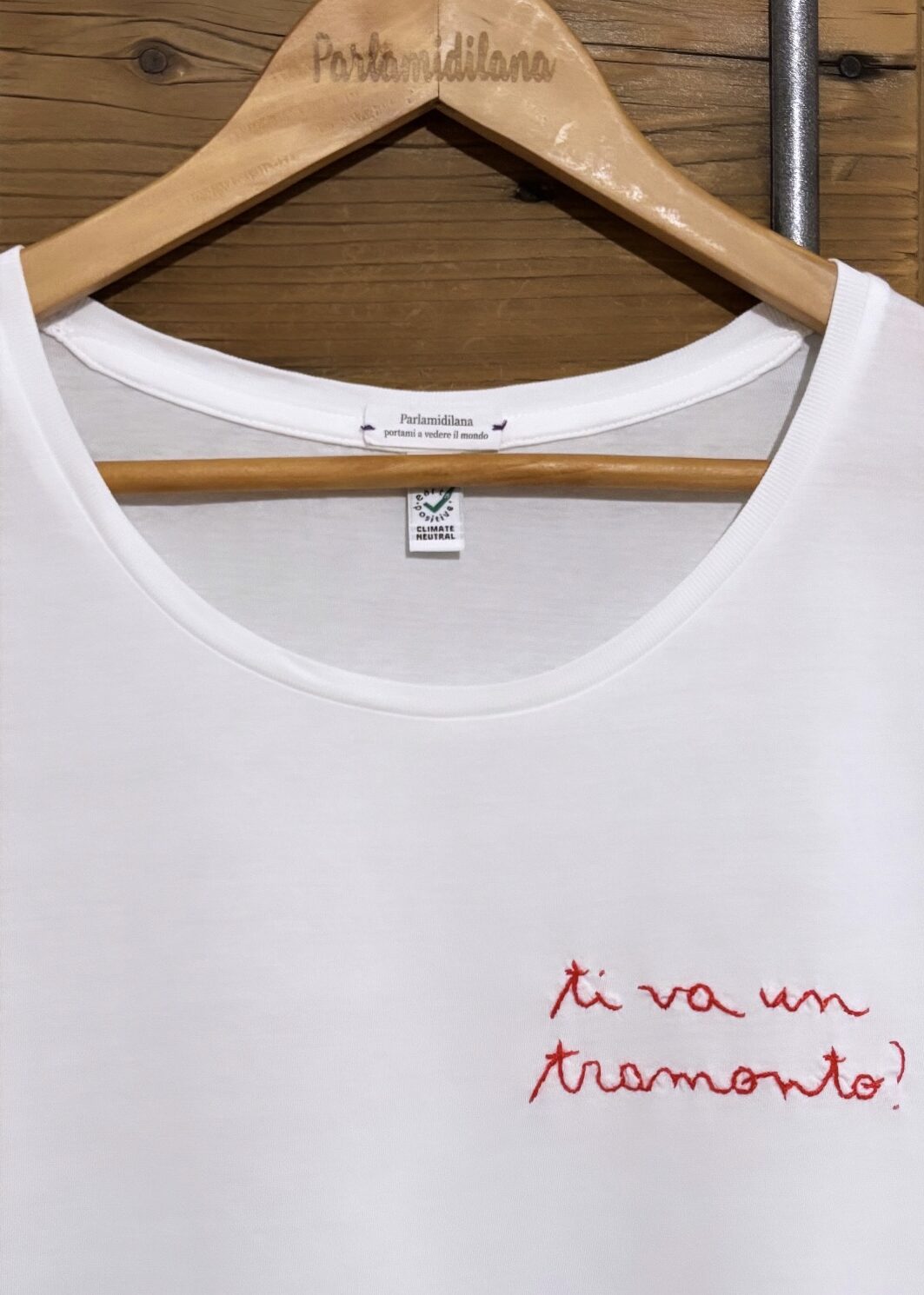 T-shirt “TI VA UN TRAMONTO?” ricamata a mano. Vedi tabella TAGLIE in galleria foto