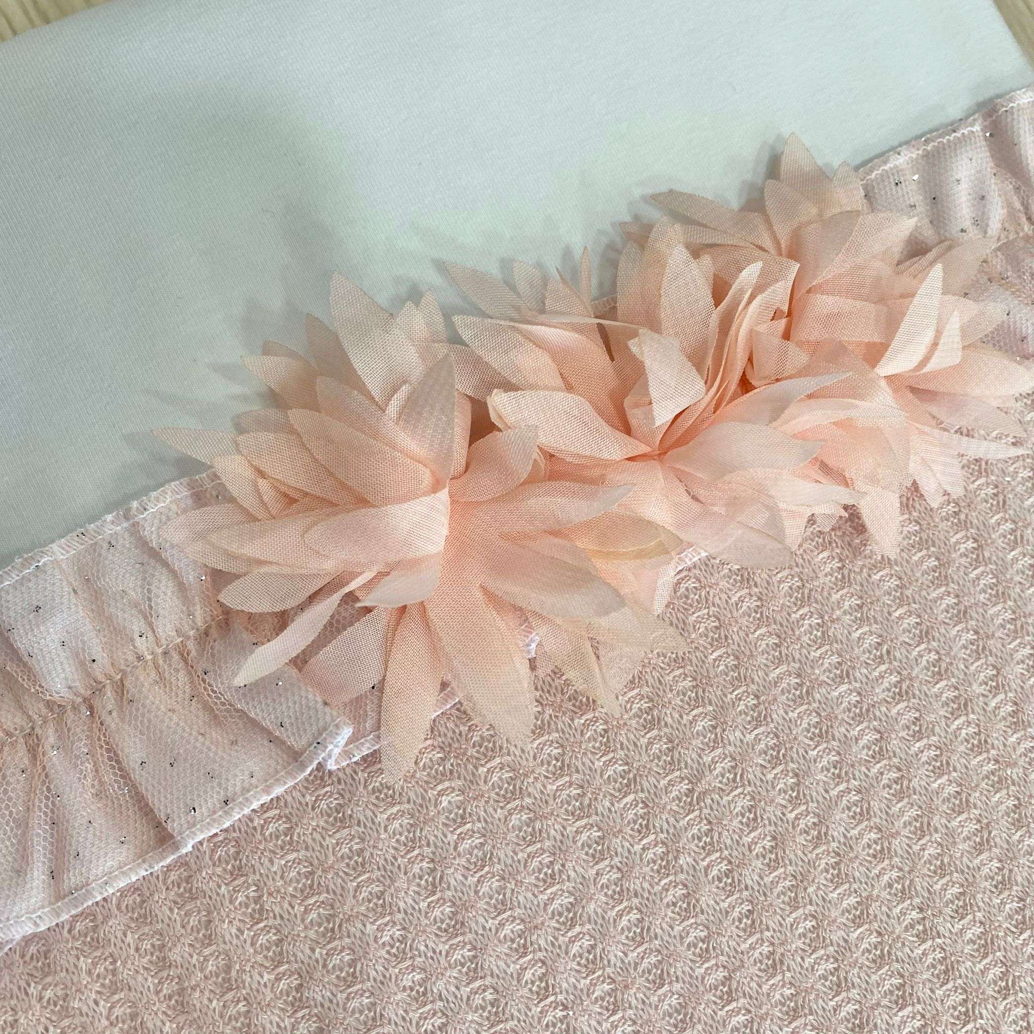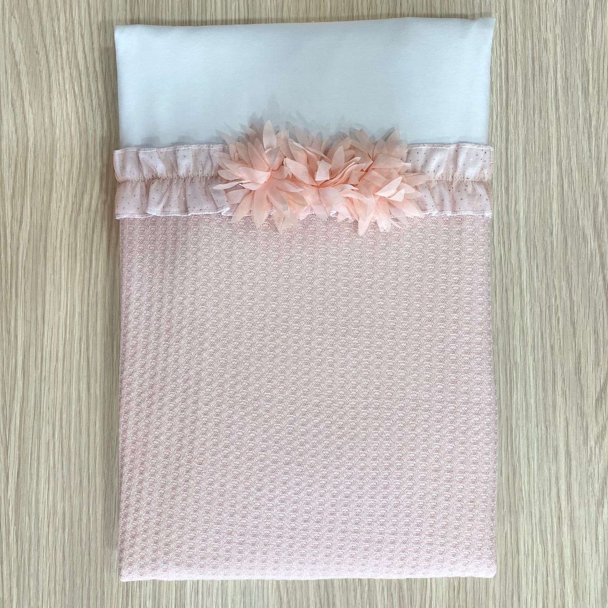 Trapuntina sfoderabile leggera neonata in cotone, di colore bianco e rosa, con retina in tulle con glitter argentati e applicazione di fiorellini in organza. Misura: 85×68 cm. Tema: LARA Articolo: 2360
