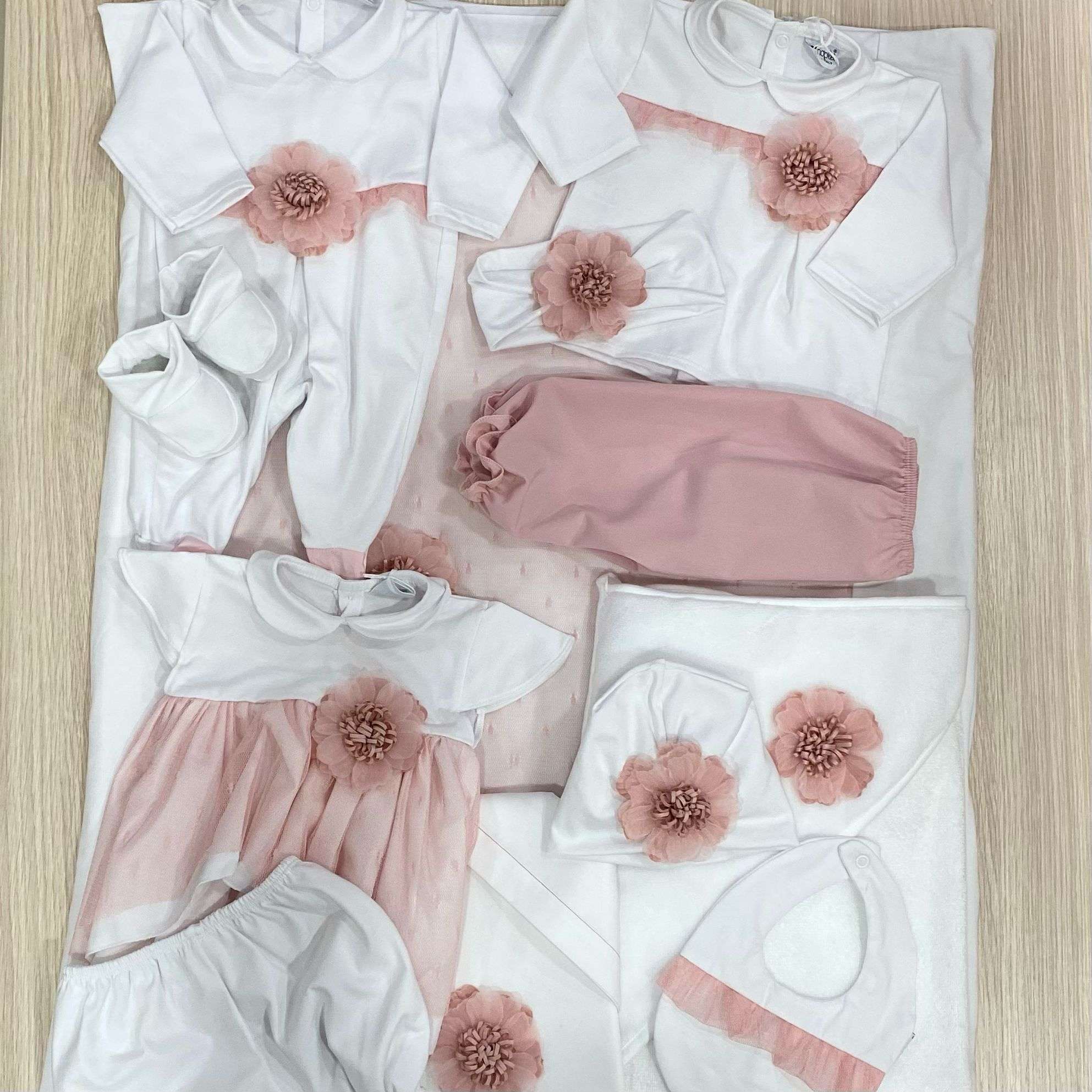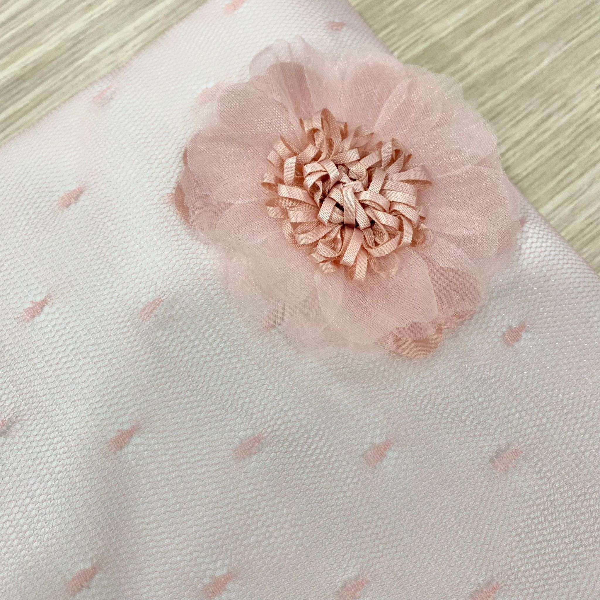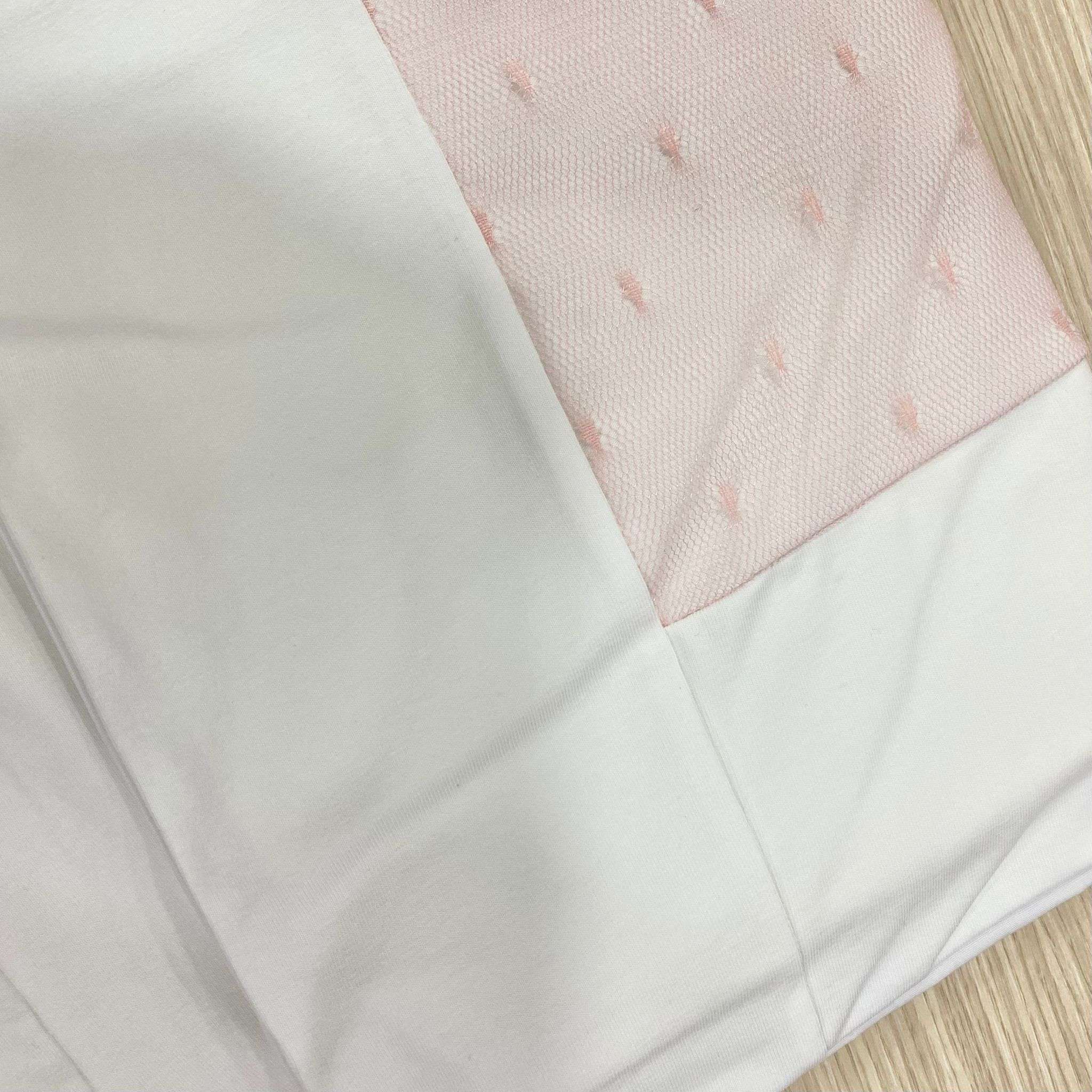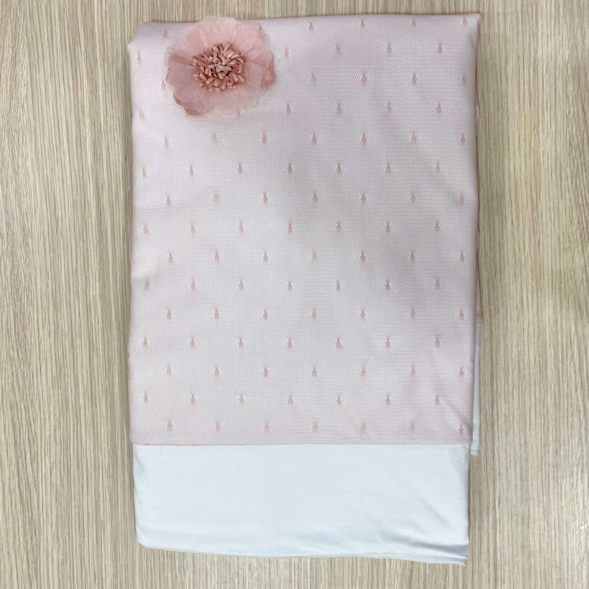 Trapuntina sfoderabile leggera neonata in cotone, di colore bianco e rosa, con retina in tulle e applicazione di fiorellino. Misura: 85×68 cm. Tema: GAIA Articolo: 2260