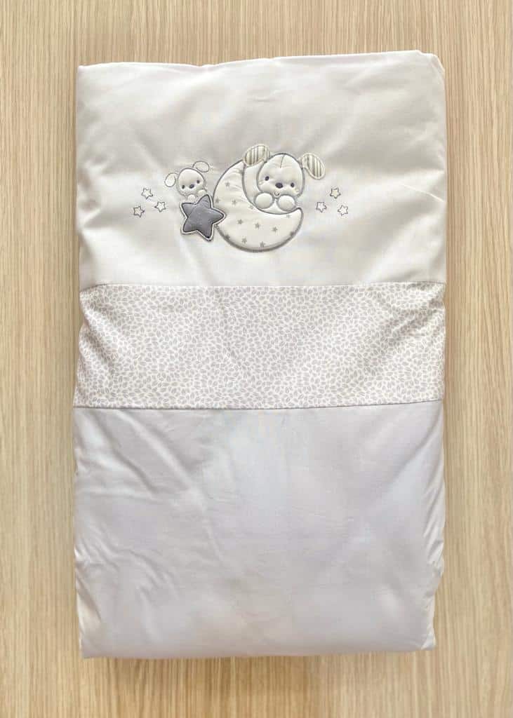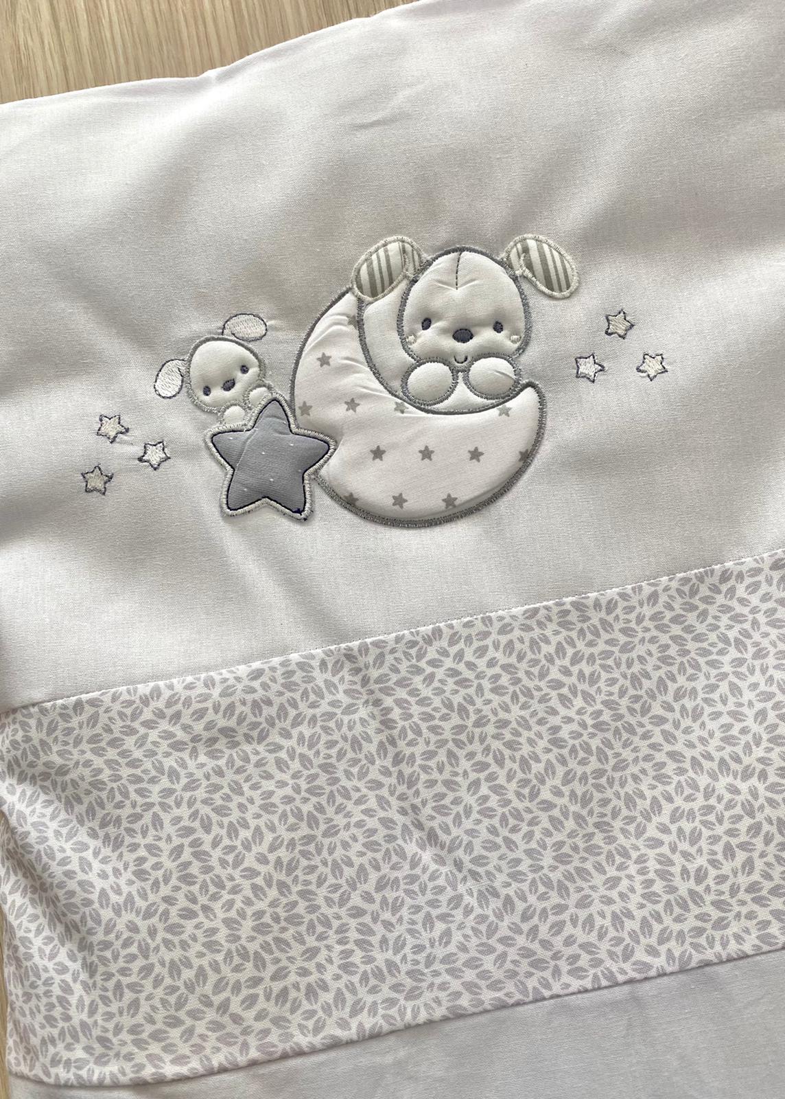 Trapuntina sfoderabile maxiculla neonato/a in morbido tessuto, di colore bianco e grigio con disegno ricamato in rilievo. Misure adatte per materasso: 50×90 cm. 100% Cotone.