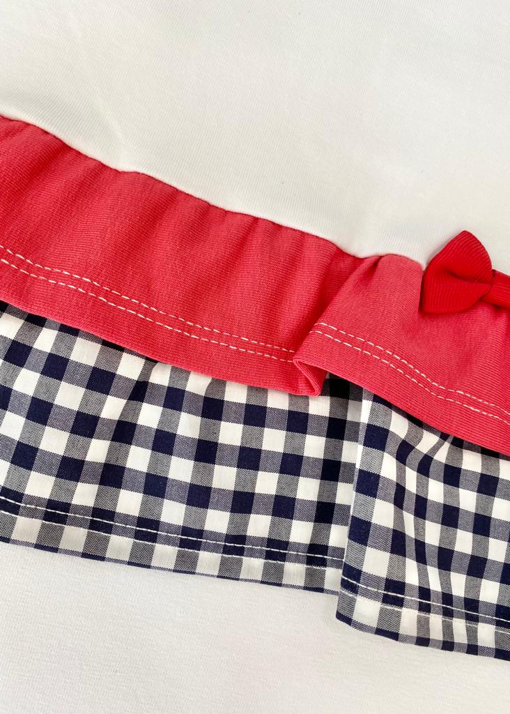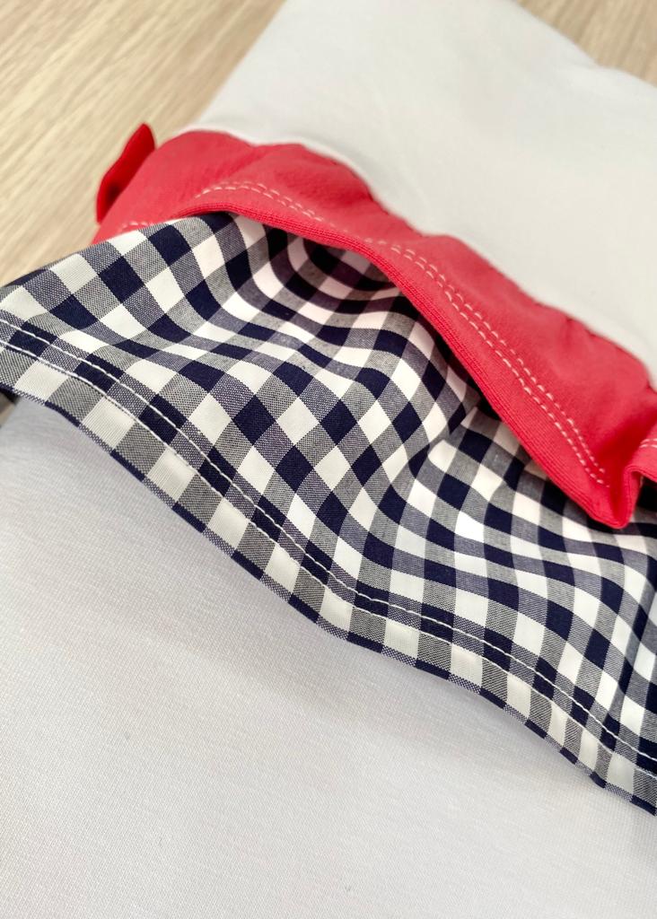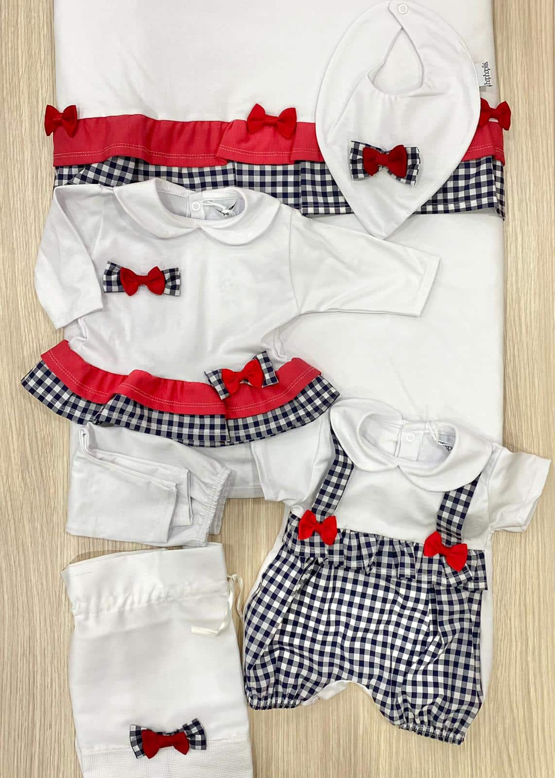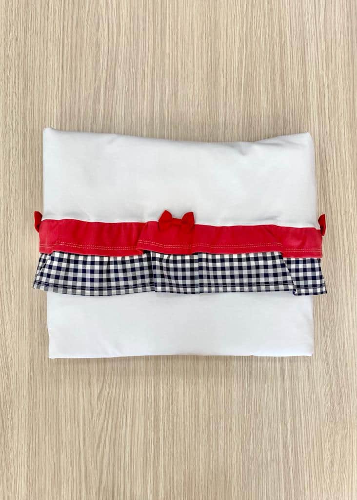Trapuntina sfoderabile neonata, in morbido cotone, di colore bianco e blu, con dettagli di colore rosso e con applicazioni di fiocchetto. Trapuntina sfoderabile adatta per i periodi primaverili. Misura: 85×68 cm.