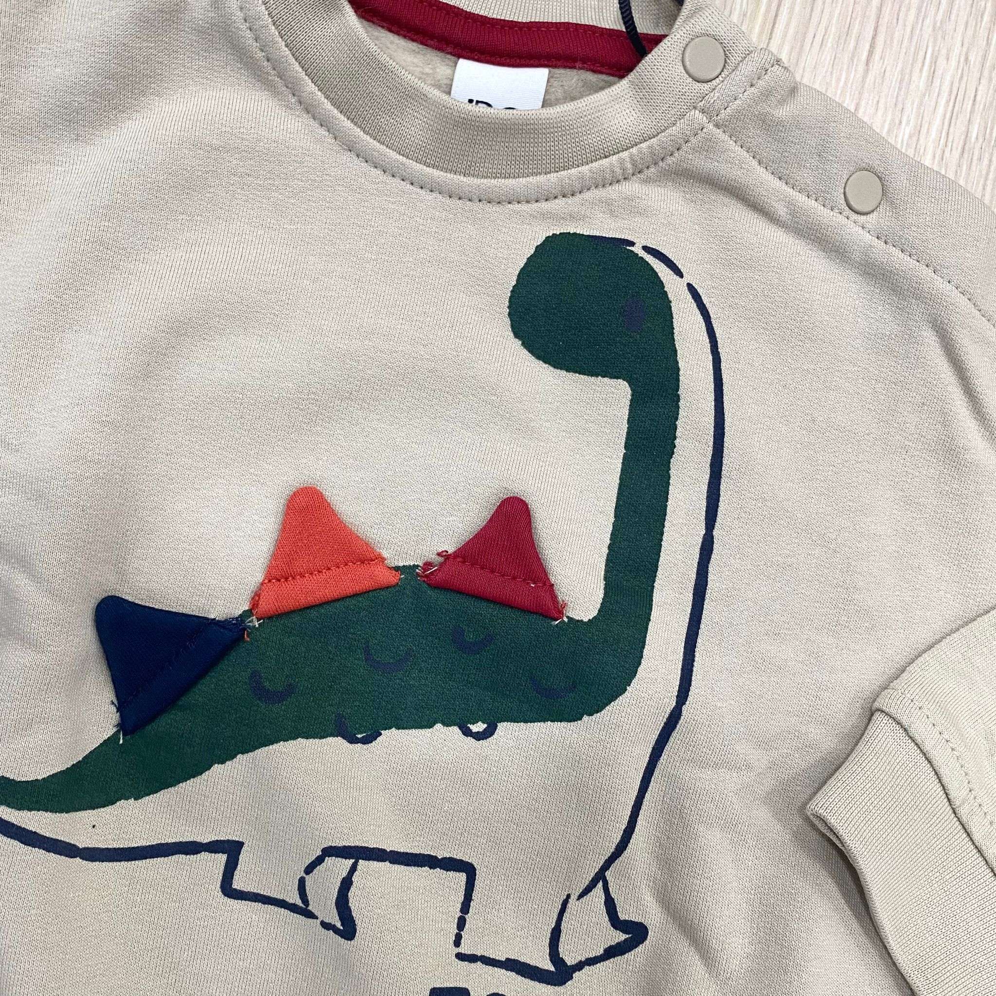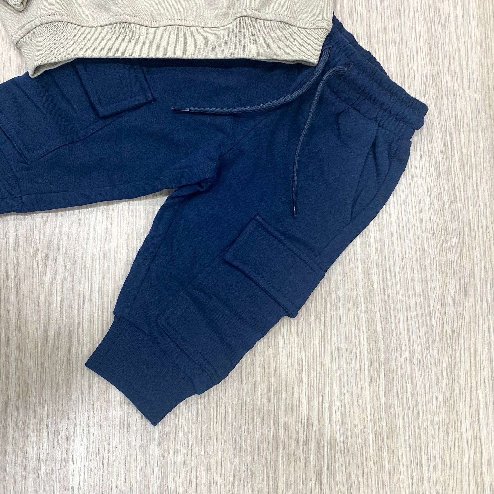 Tuta due pezzi bambino in cotone felpato, di colore beige e blu, con stampe di vari colori. Tuta con pantalone con tasconi. Tuta oversize. 100% Cotone.