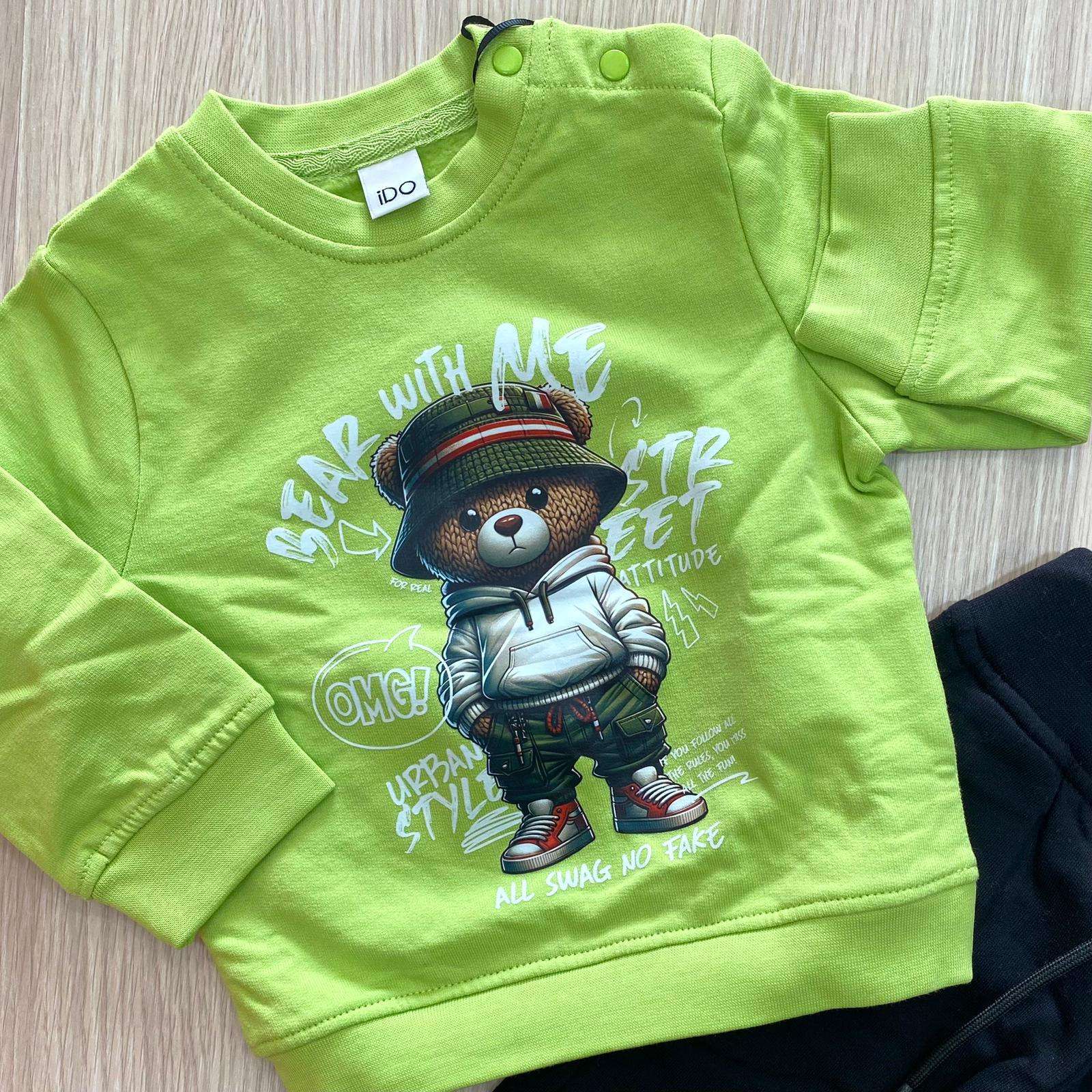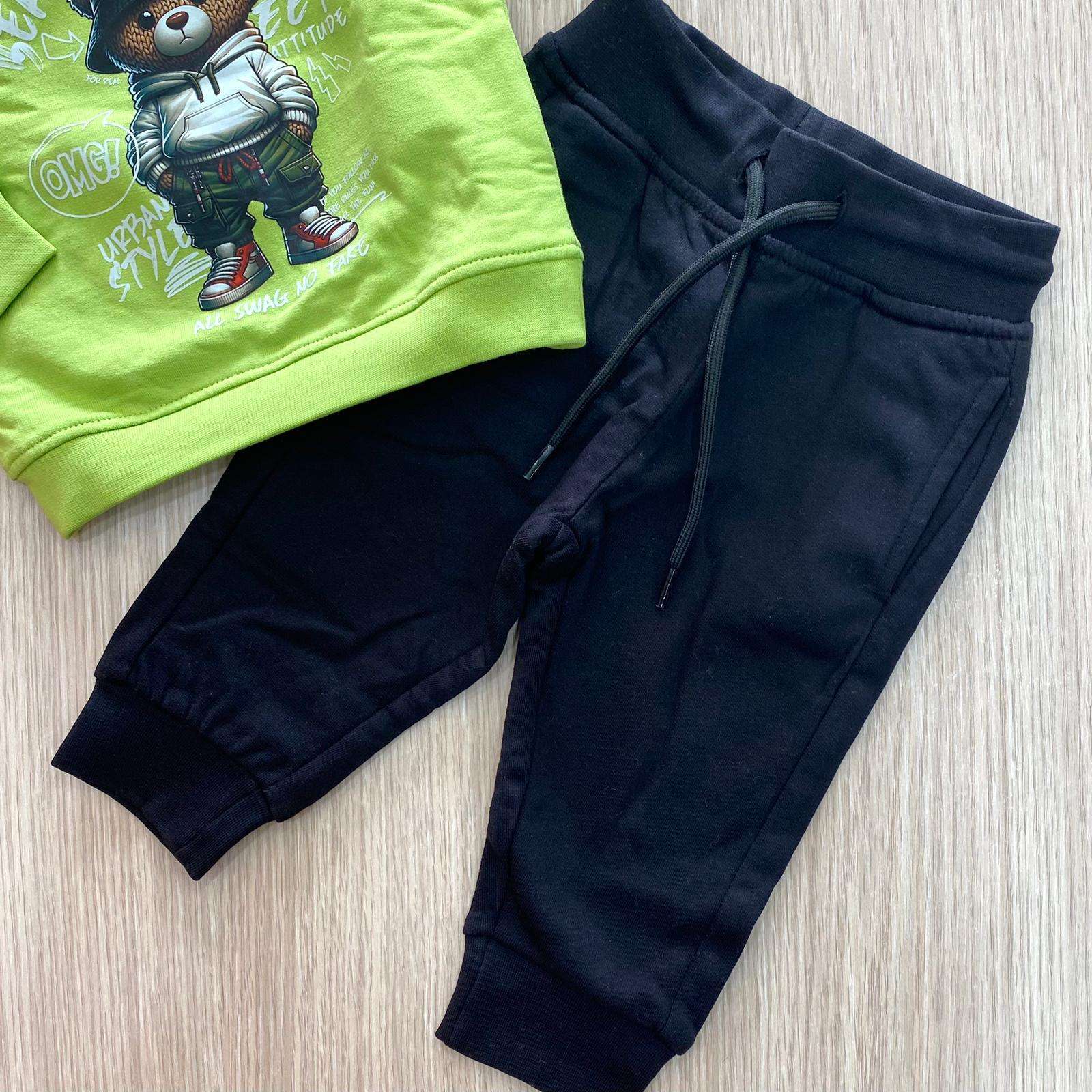 Tuta due pezzi neonato/bambino in cotone felpato, di colore verde e nero, con stampe di vari colori. 100% Cotone.