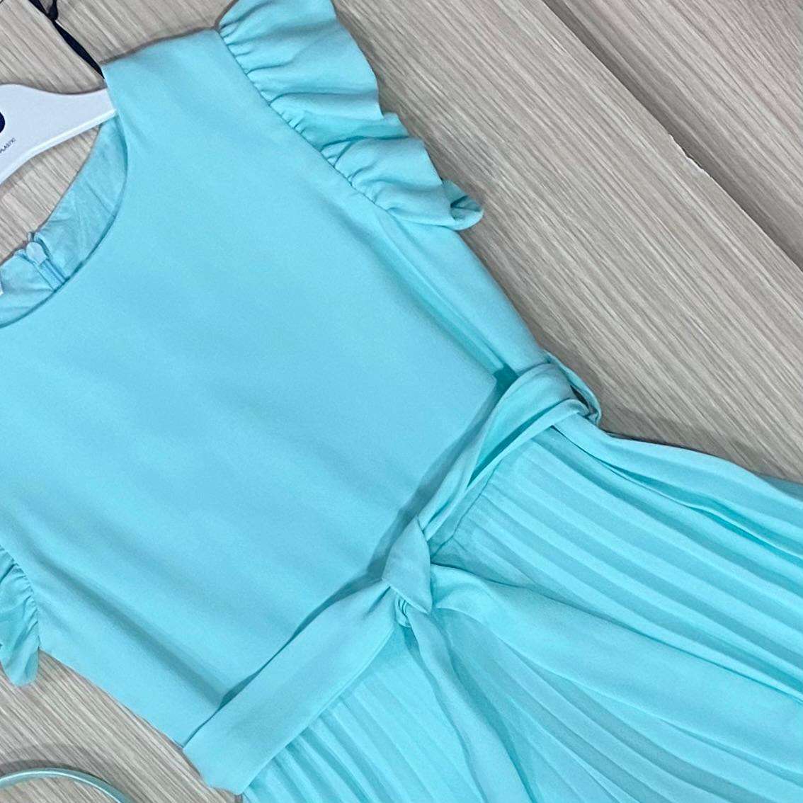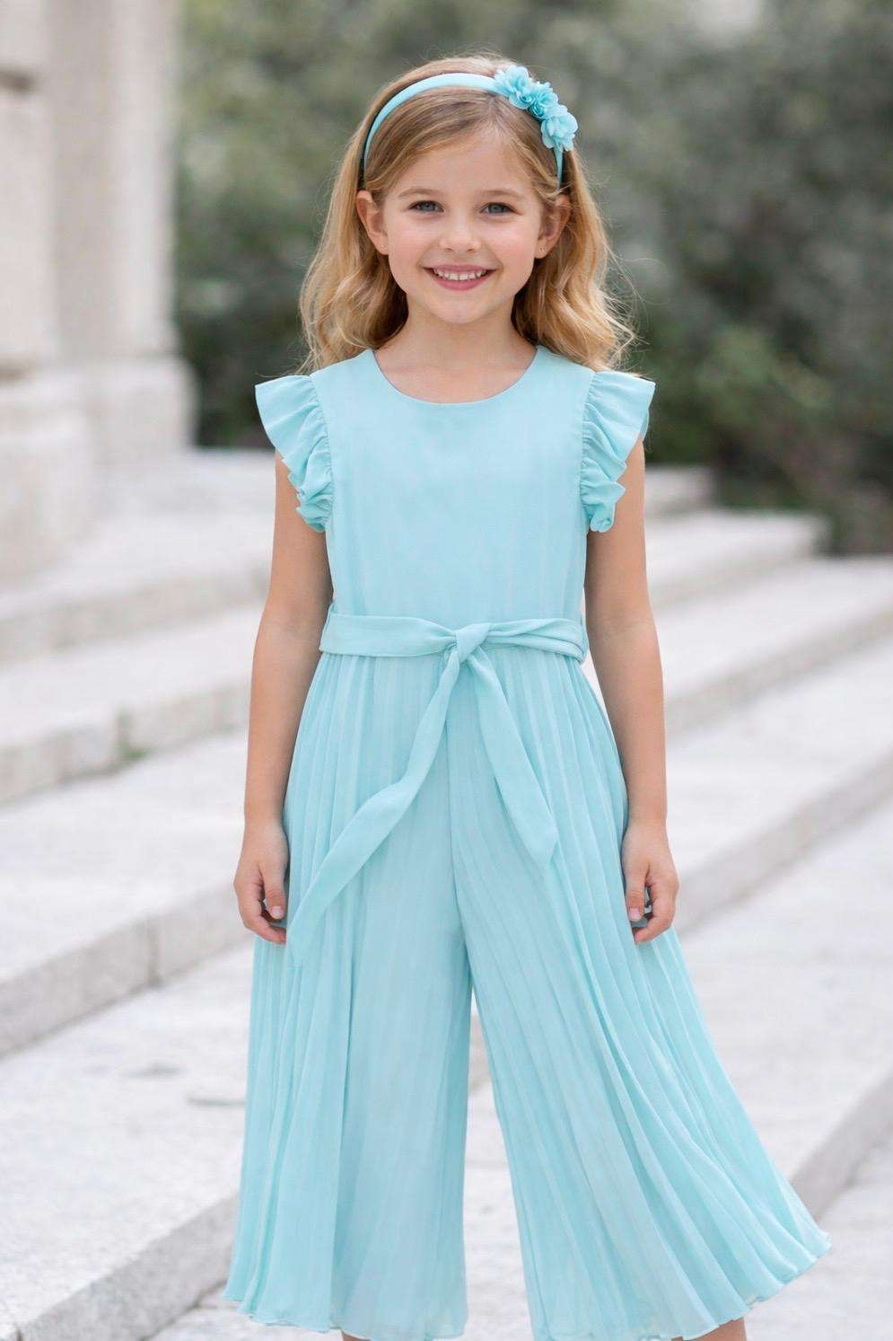 Tuta bambina iDO elegante in chiffon plissé Raffinata e delicata, questa tuta bambina firmata iDO è la scelta perfetta per cerimonie, feste ed eventi speciali. Realizzata in leggero chiffon plissé, si distingue per il suo colore verde acqua luminoso e sofisticato. Il modello presenta un corpetto liscio con graziose maniche ad aletta con ruches, che donano un tocco romantico e femminile. In vita è arricchita da una cintura coordinata annodabile, che valorizza la silhouette garantendo comfort e vestibilità. I pantaloni ampi a palazzo con effetto plissettato assicurano movimento, leggerezza ed eleganza ad ogni passo. Perfetta da abbinare a ballerine o…