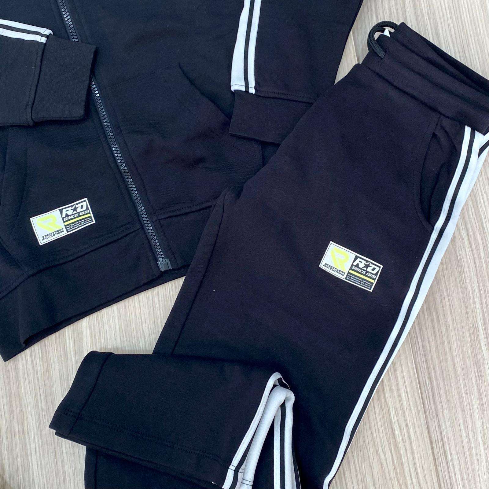 Tuta tre pezzi bambino/ragazzo in cotone felpato, di colore nero e bianco. Tuta oversize. Set composto da felpa con cappuccio e cerniera, pantalone jogger e t-shirt. La felpa è nera con zip intera, cappuccio e bande bianche a contrasto sulle maniche, logo stampato sul petto. I pantaloni coordinati hanno elastico in vita e bande laterali. Completa il look la t-shirt bianca con stampa. Comodo e grintoso, perfetto per il tempo libero e le attività sportive.