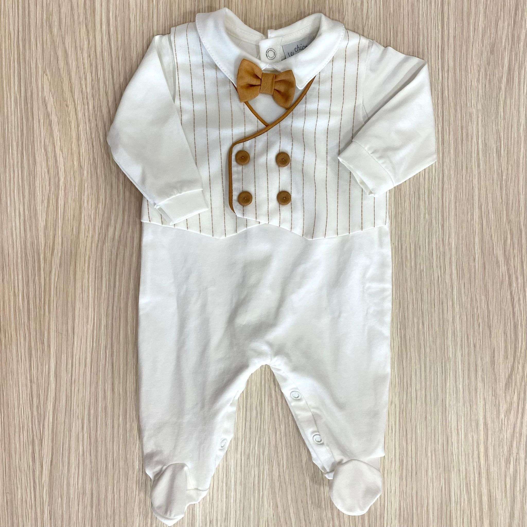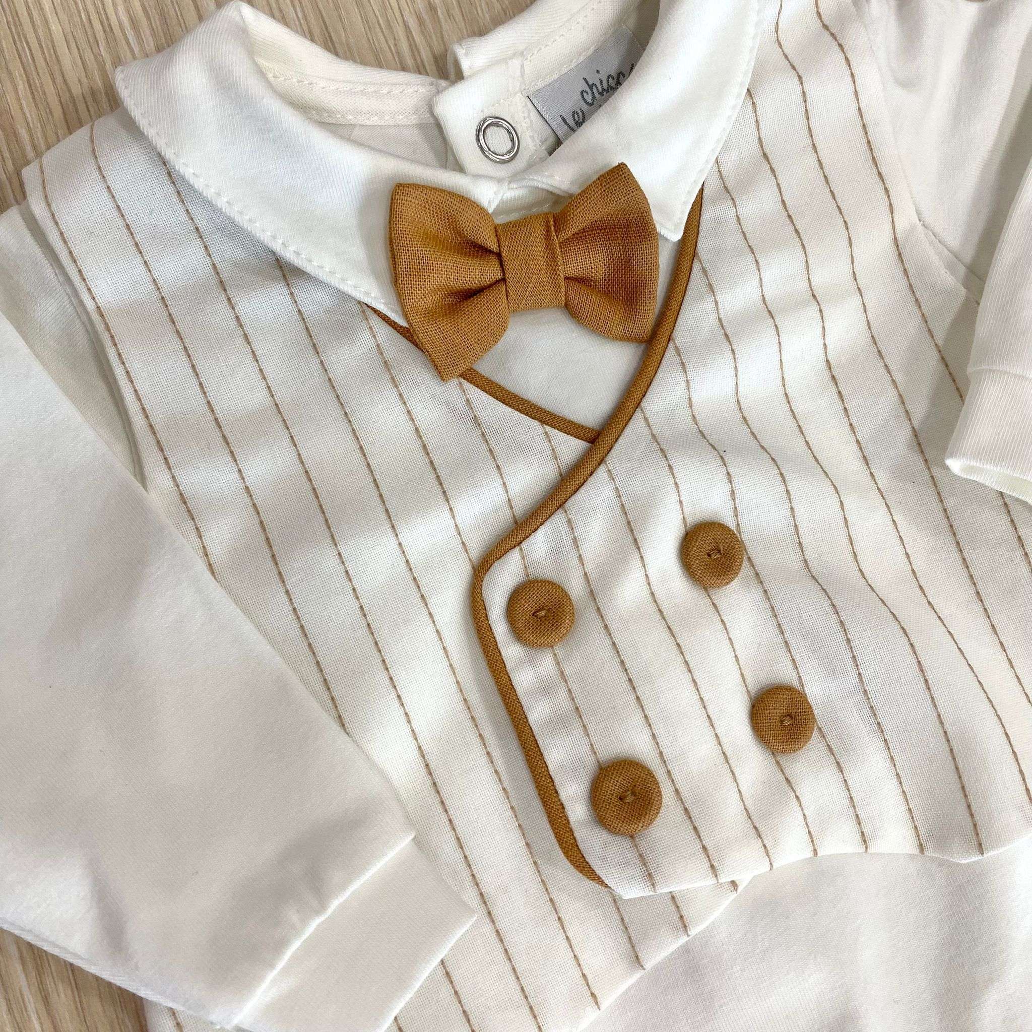 Tutina intera neonato in cotone, di colore panna e cammello, con dettaglio di finto gilet e finto papillon. 0/1 Mese: 50/56 cm. 1/3 Mesi: 56/62 cm. Made in Italy.