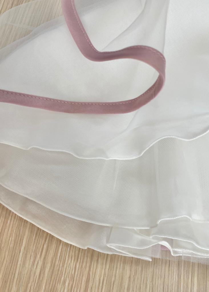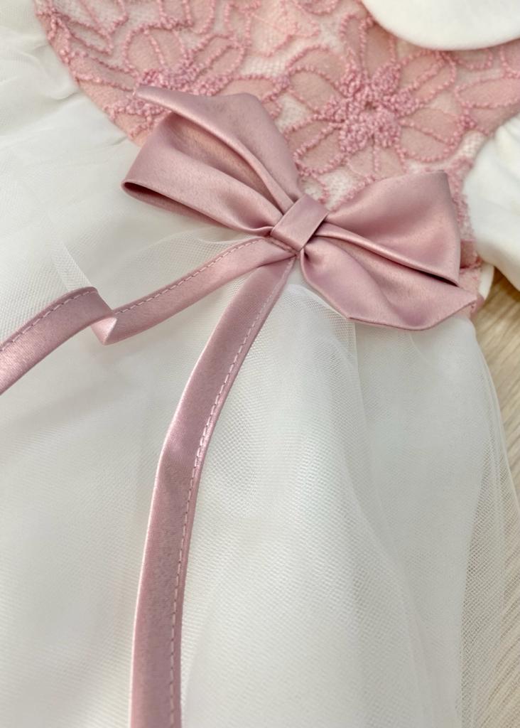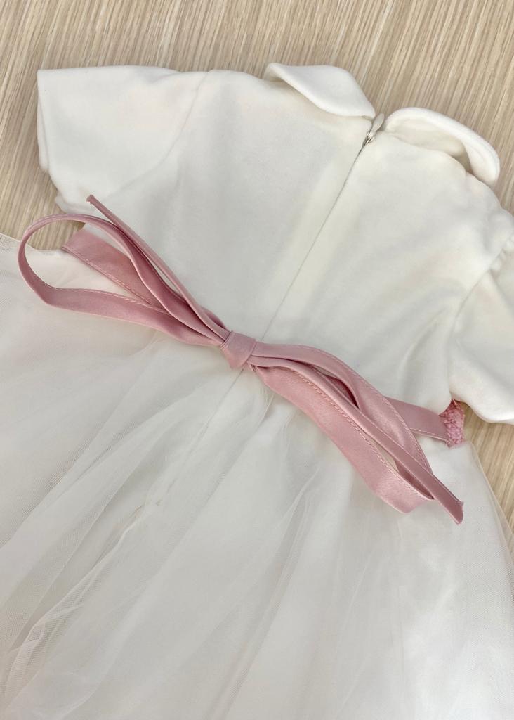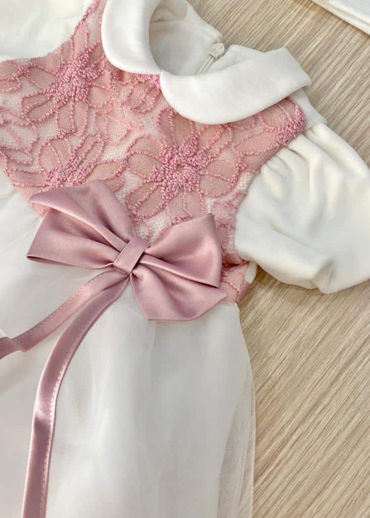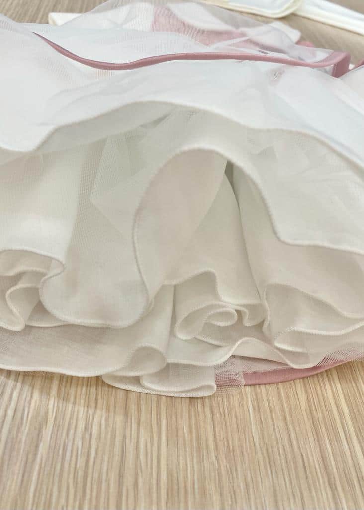 Vestina neonata con coprispalla battesimale, in morbida ciniglia composta da veri strati alternati di tulle e tessuto in caldo cotone, di colore panna e rosa, con dettaglio di fiocco in vita e bordini in raso. Corpetto in tulle macramè di colore rosa. Apertura sul retro con cerniera. Coprispalla in morbido e caldo tessuto. Vestina ciniglia: 80% Cotone; 20% Poliestere. Tulle: 100% Poliammide. Fodera: 100% Cotone. Coprispalla: 95% Cotone; 5% Elastan. Made in Italy