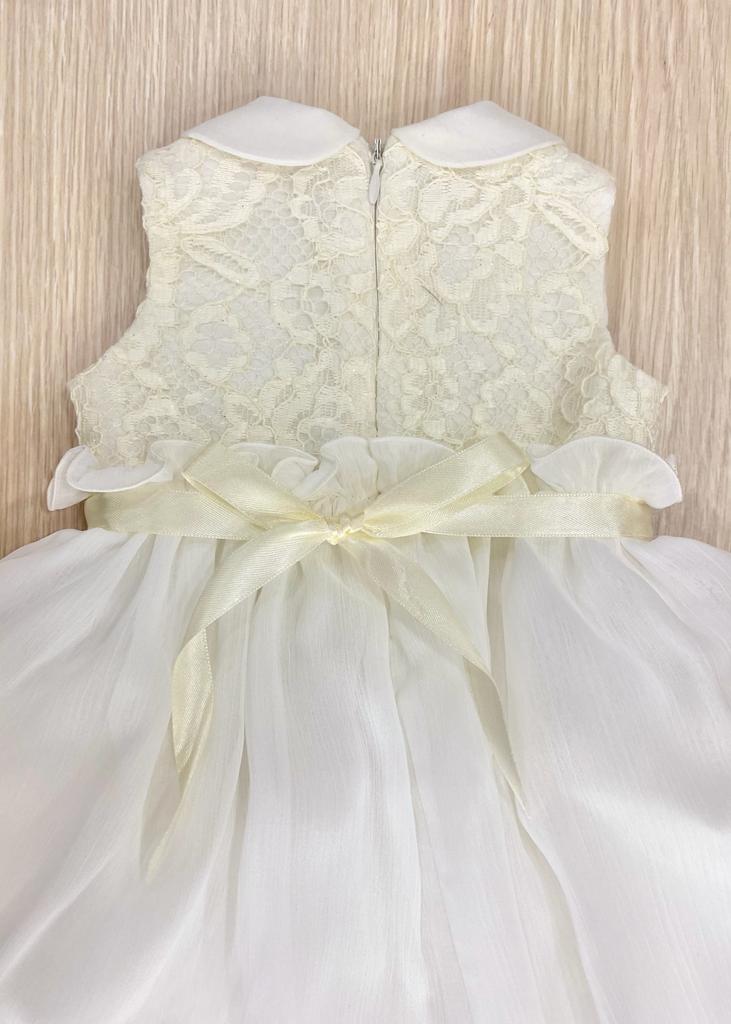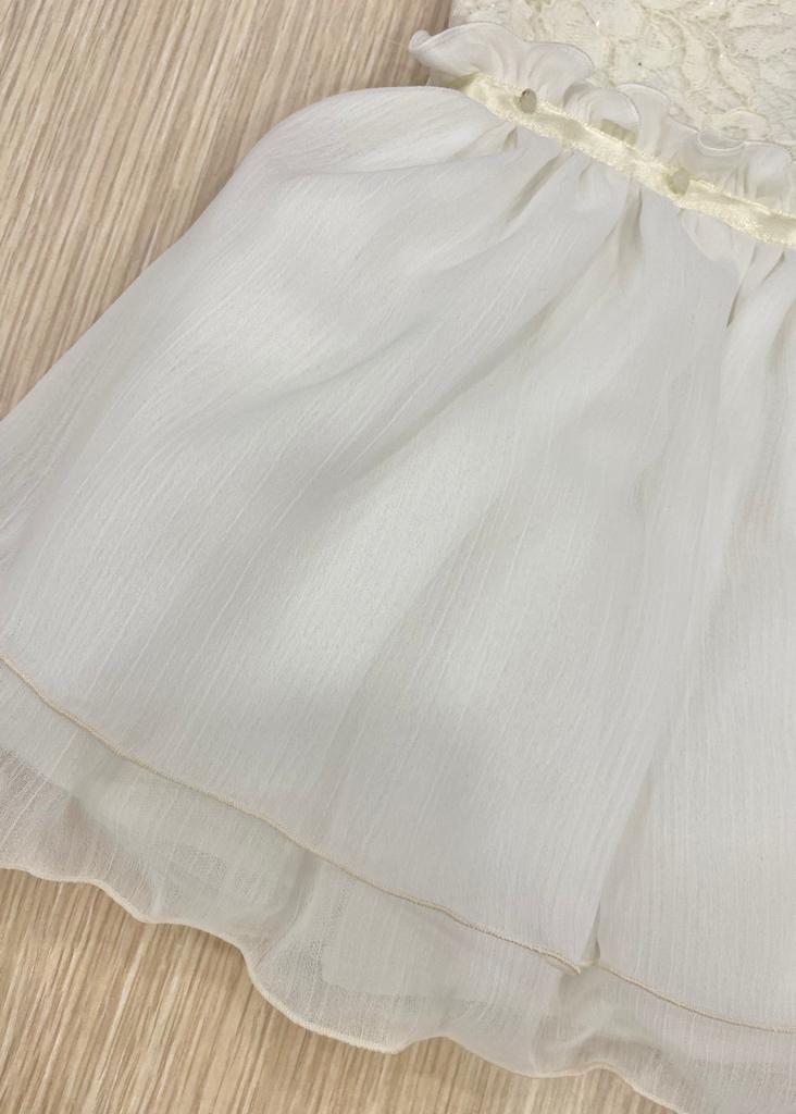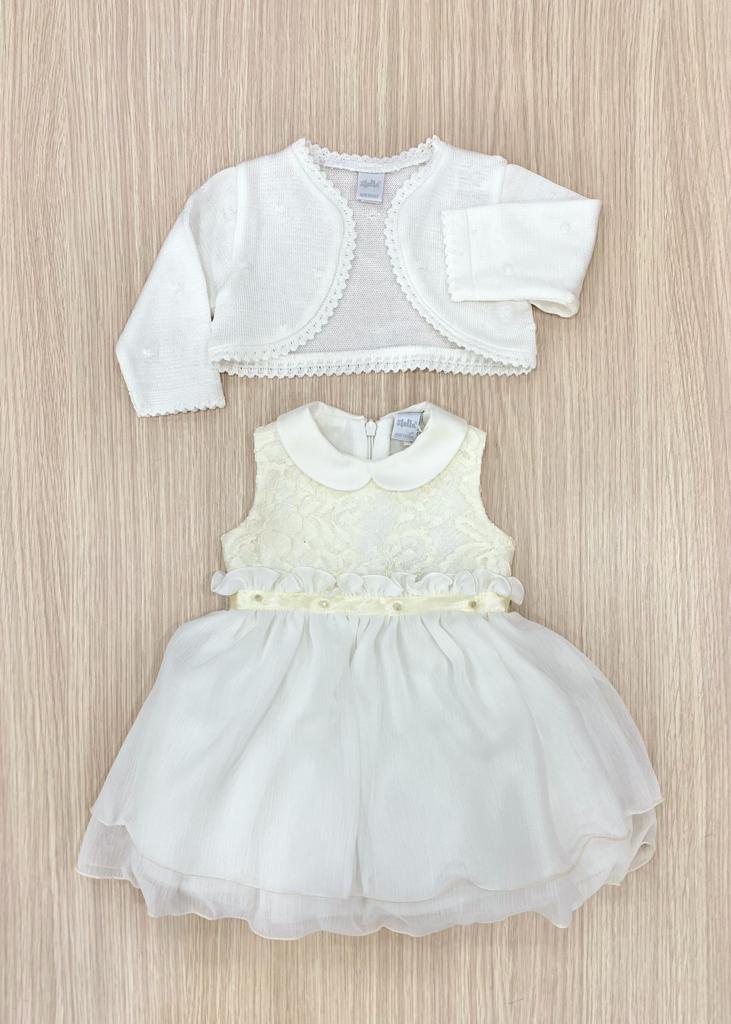 Vestina e coprispalle da battesimo/ da cerimonia, di colore vaniglia, in morbidissimo tulle e organza. Vestina scamiciata con corpetto con interno foderato in morbido cotone, dettagli all’esterno in pizzo macramè brillantinato. Applicazione fascetta in raso in vita. Coprispalle in morbido filo makò, di colore vaniglia. 100% Cotone. 100% Rayon. Inside: 65% Cotone. 35% a.f. Made in Italy.