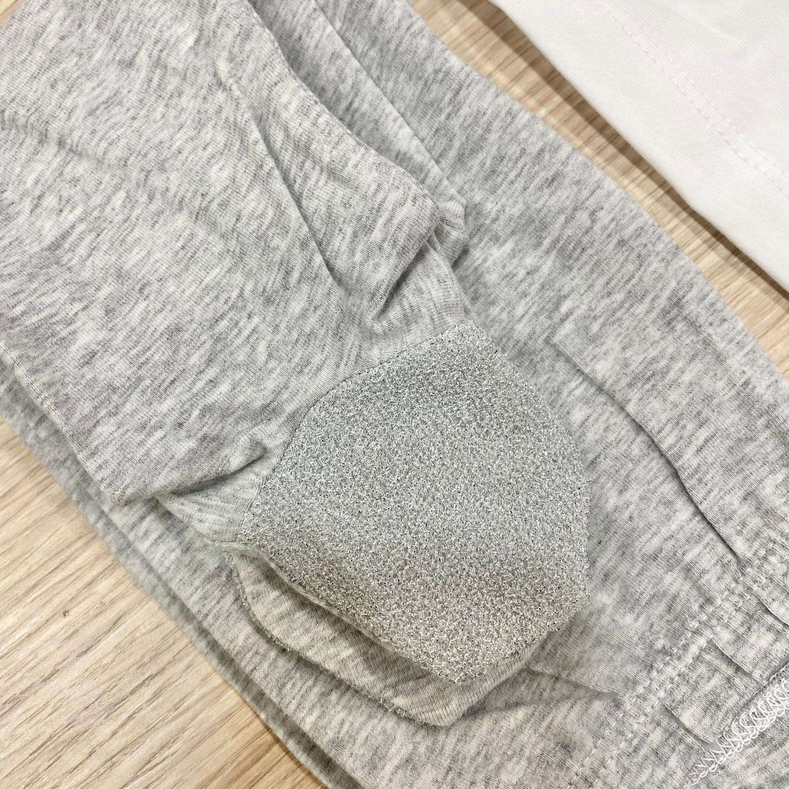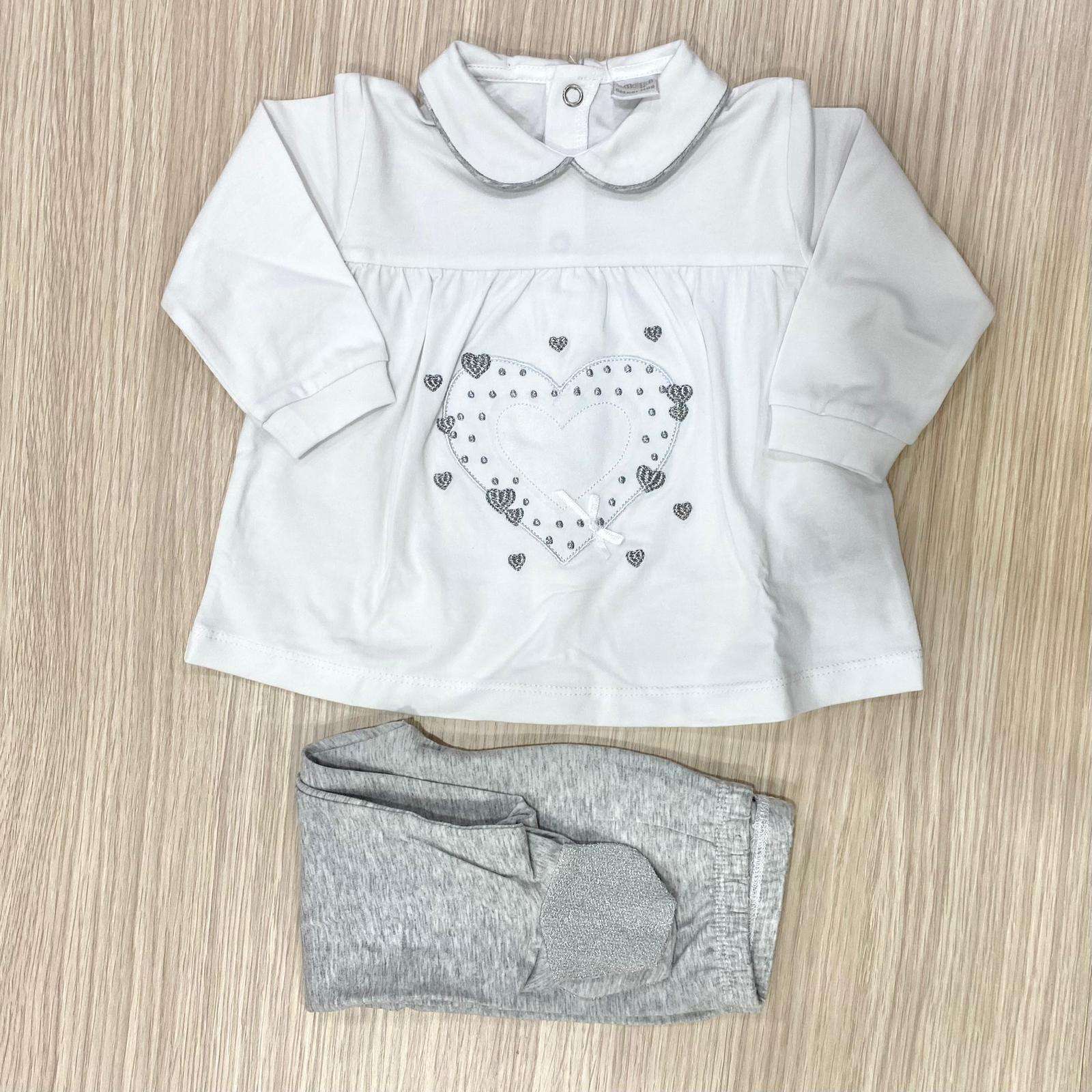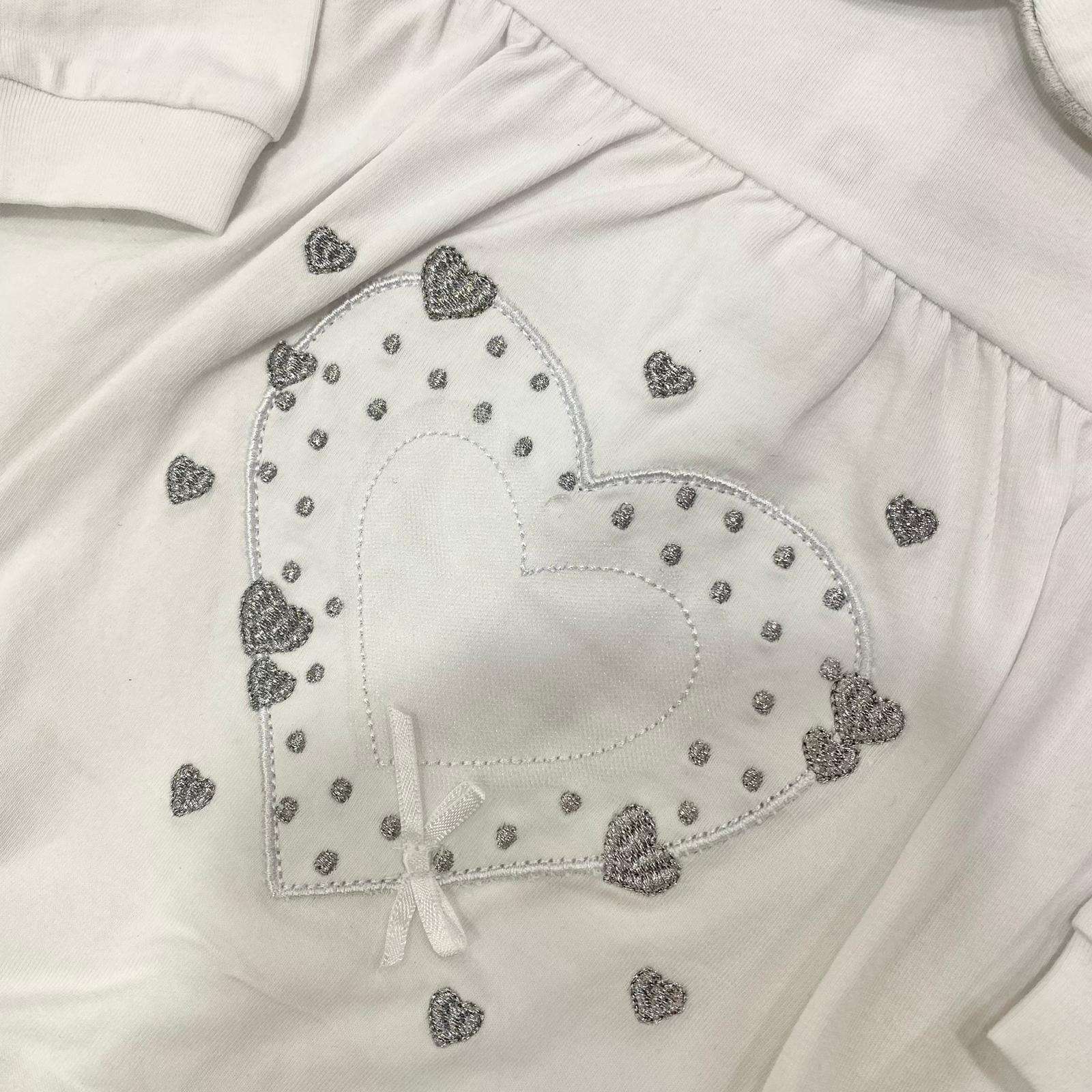 Vestina due pezzi neonata in cotone, di colore bianco e grigio, con scritta e disegno ricamato con filo argentato. 6 Mesi: 68 cm.