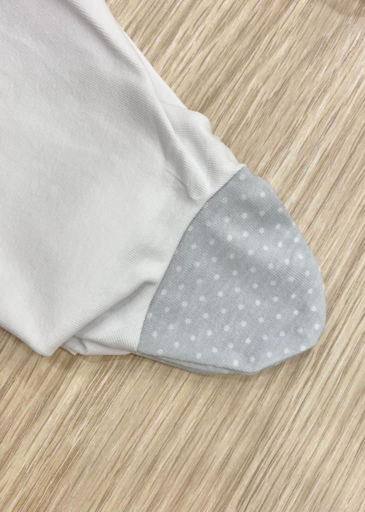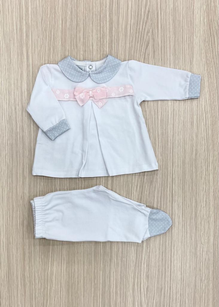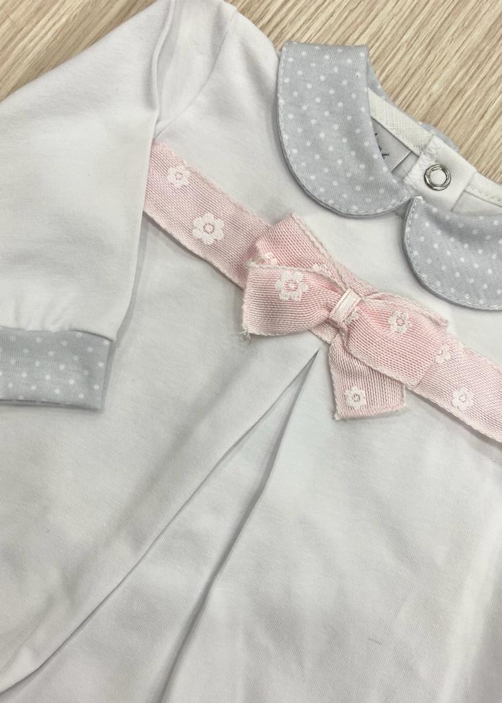 Vestina due pezzi neonata in cotone anallergico di colore bianco con dettagli in grigio con fiocco in cotone rasato in colore rosa. Apertura con bottoncini sul retro. Taglia 0/1 Mese: 50/54 cm. 90% Cotone. 10% Elastomero.