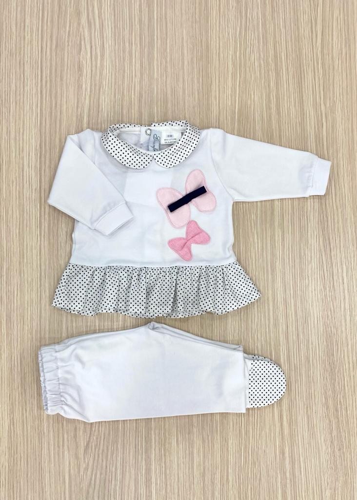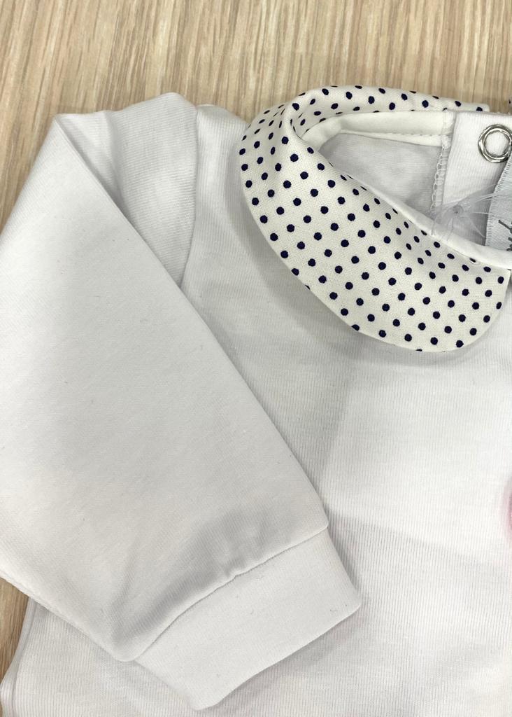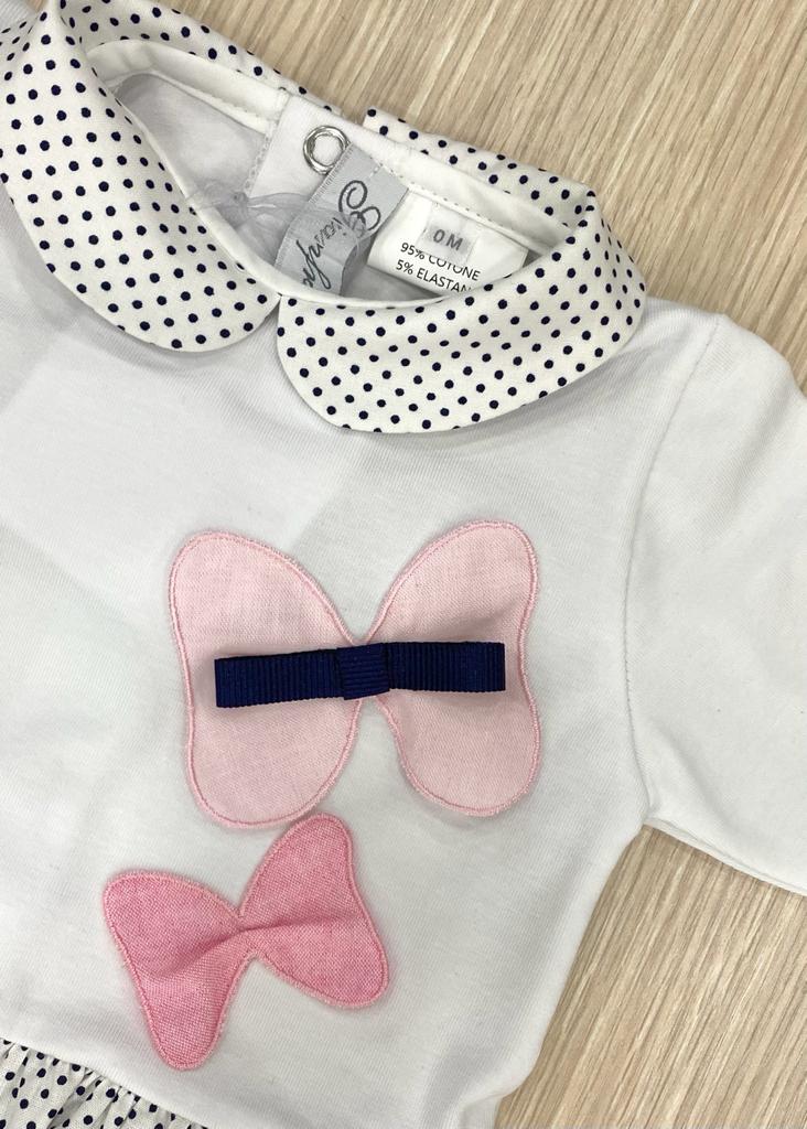 Vestina due pezzi in morbido cotone, di colore bianco, con dettagli di pois di colore blu e applicazioni in rilievo di colore rosa. Taglia 0/1 Mese: 50/54 cm. 95% Cotone. 5% Elastan. Made in Italy.