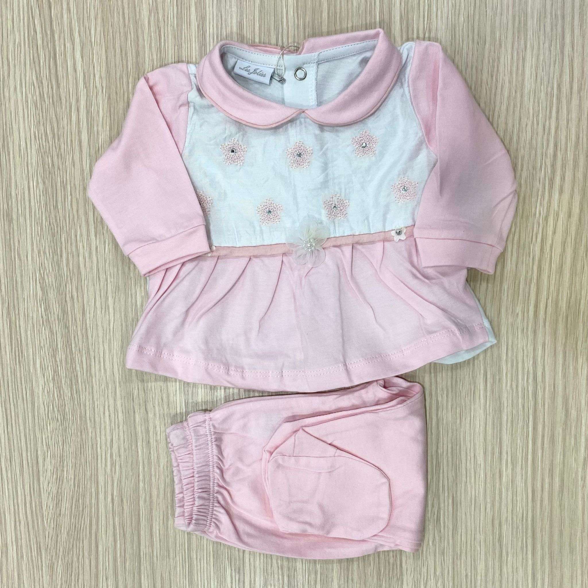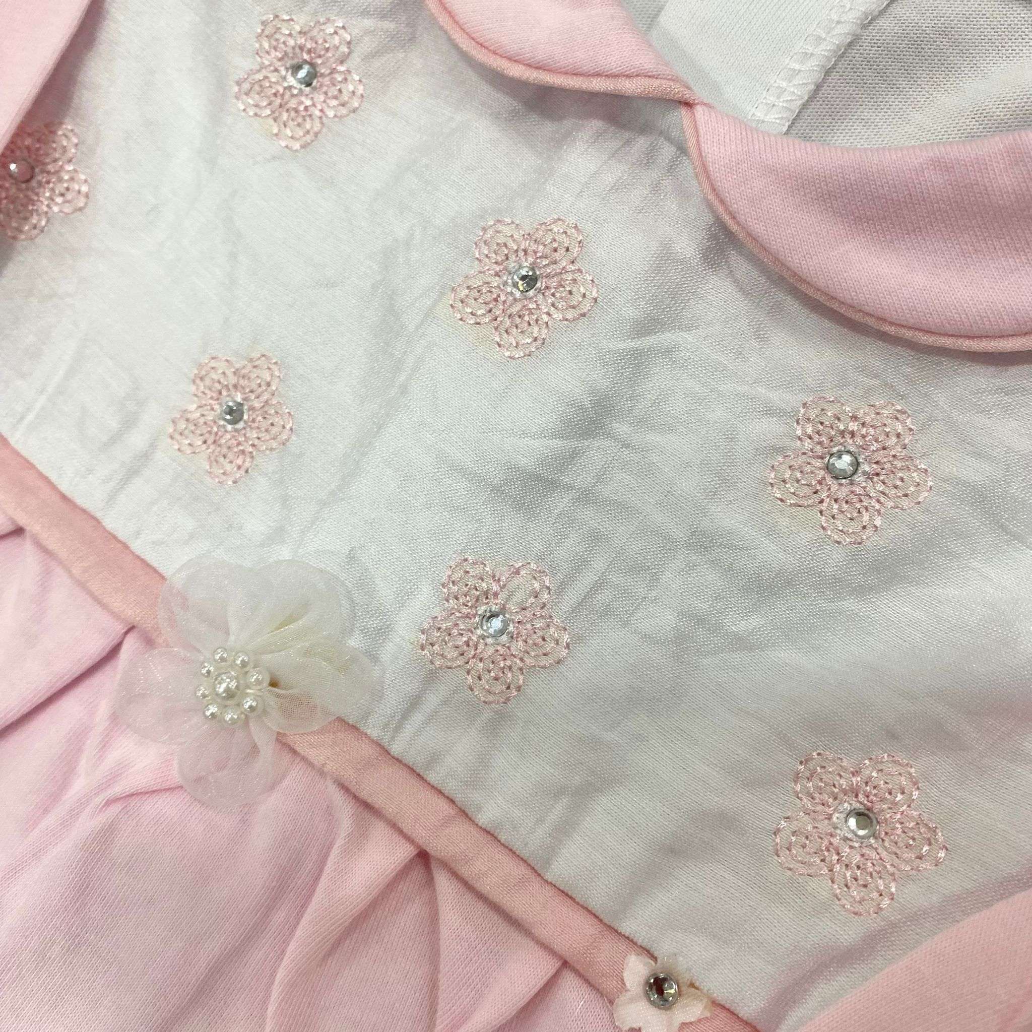 Vestina due pezzi neonata in cotone, di colore rosa e bianco, con dettaglio di fiorellini ricamati e applicazione di strass. Vestina due pezzi con applicazione di fiorellino. 0/1 Mese: 50/56 cm. 1/3 Mesi: 56/62 cm.
