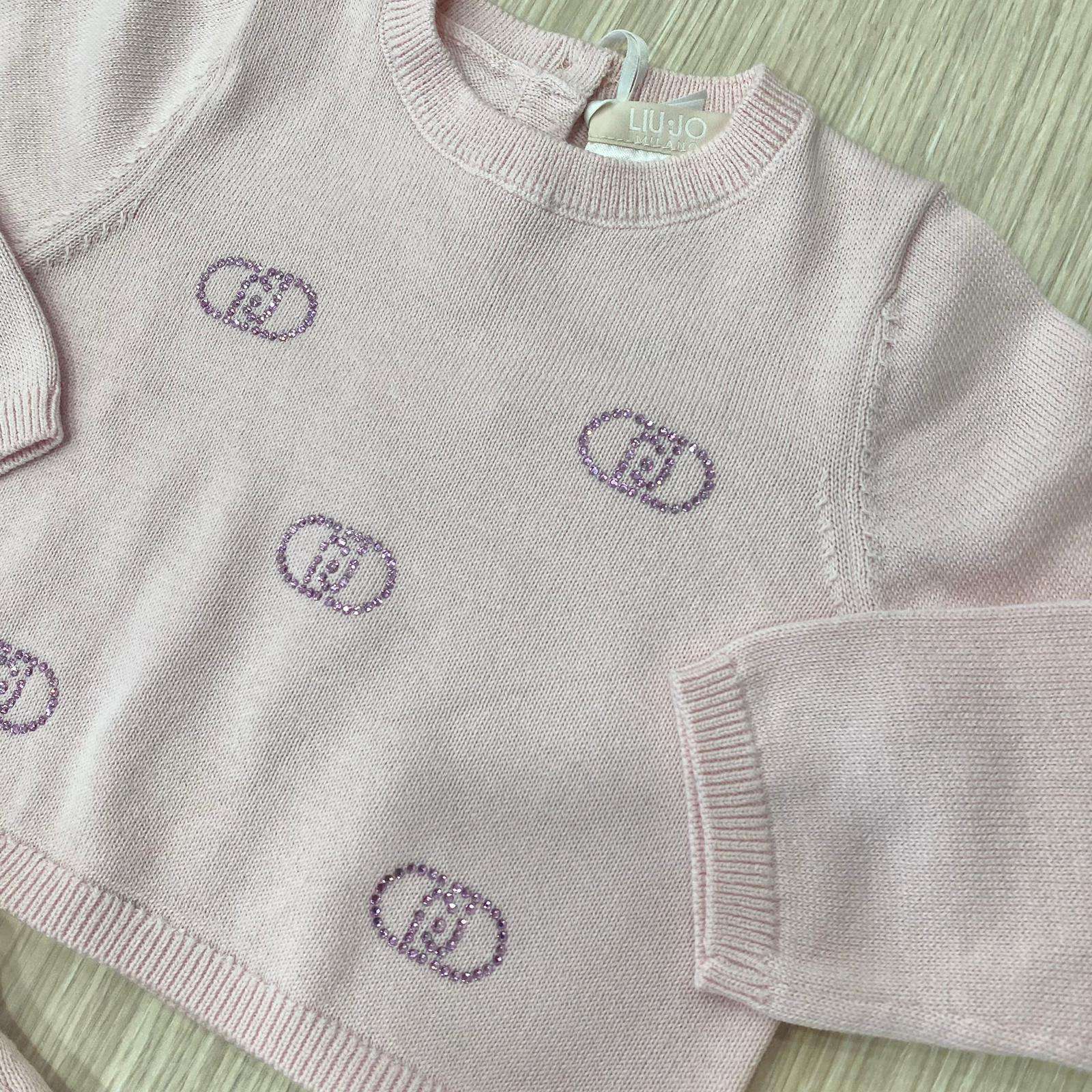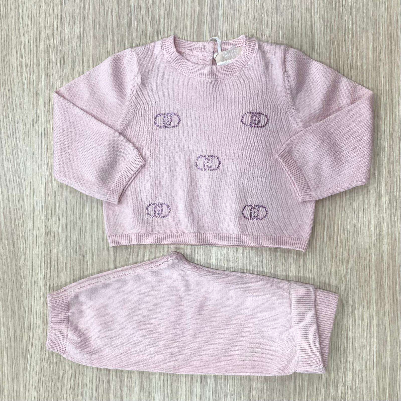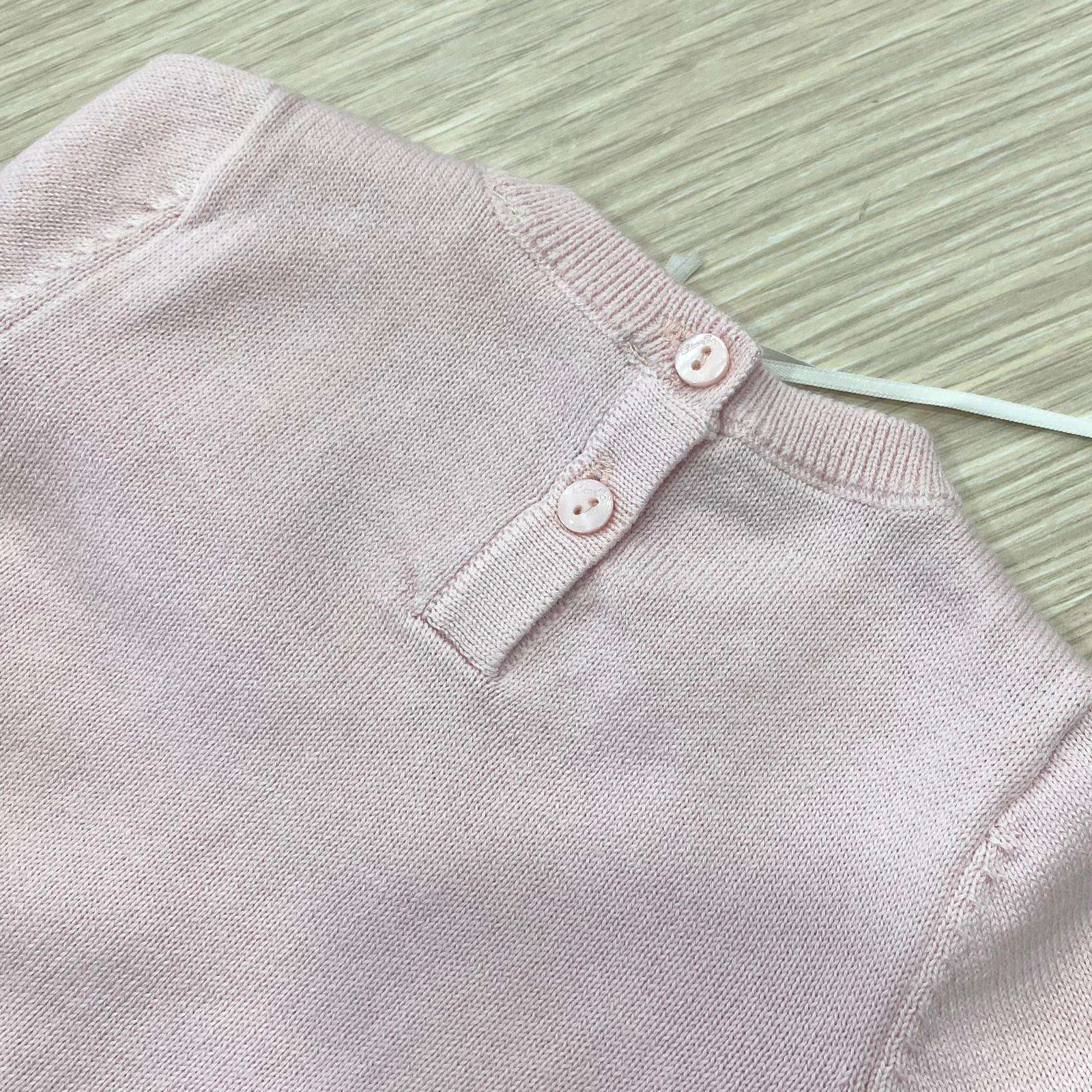 Vestina due pezzi neonata in filo di cotone, di colore rosa, con apertura di bottoncini e applicazione di strass. 3 Mesi: 62 cm.