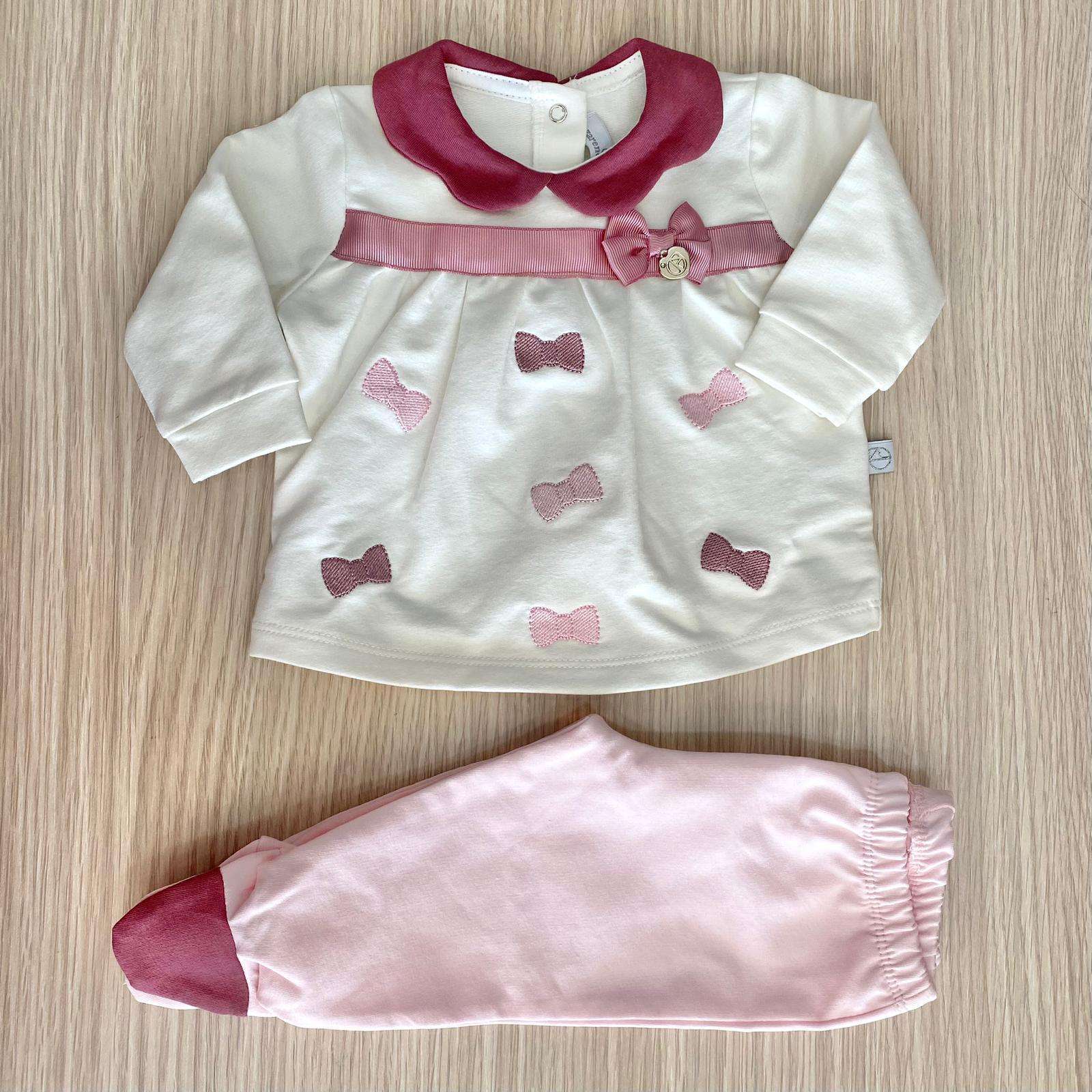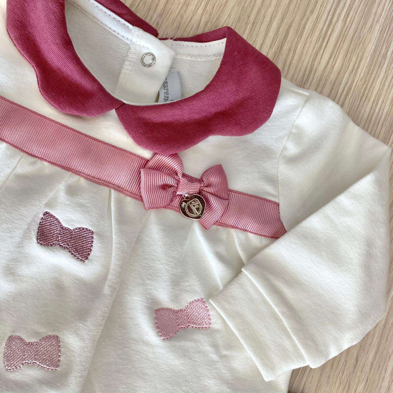 Vestina due pezzi neonata in caldo cotone felpato, di colore panna, rosa e vinaccio, con disegno ricamato e applicazione di fiocchetto. 0/1 Mese: 50/56 cm. 1/3 Mesi: 56/60 cm. 3/6 Mesi: 60/66 cm. 95% Cotone. 5% Elastane.