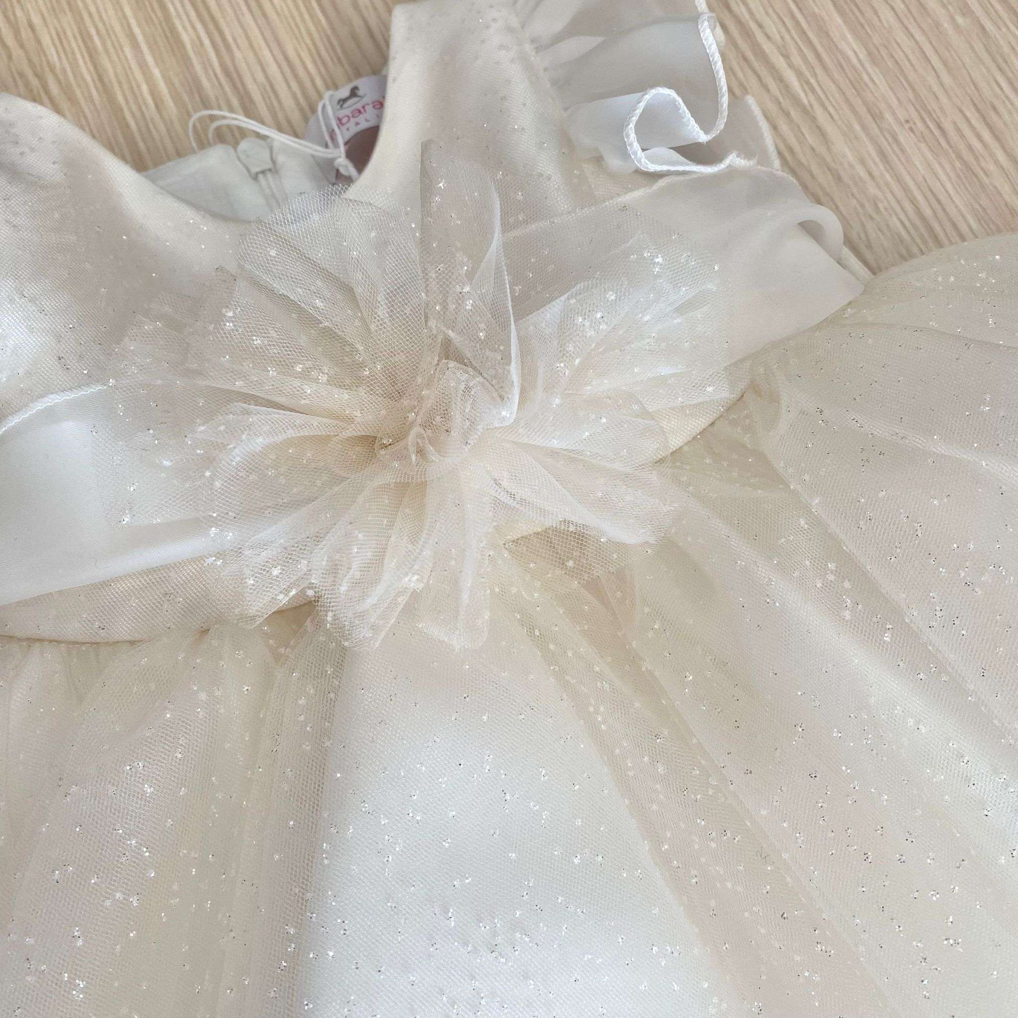 Vestina bambina elegante in tulle e cotone rasato, con fodera in cotone, con balze in tulle brillantinato. Vestina di colore avorio, con dettaglio di fiocco regolabile in organza. Abbottonatura con cerniera. Vestina elegante ideale per battesimo e cerimonie.
