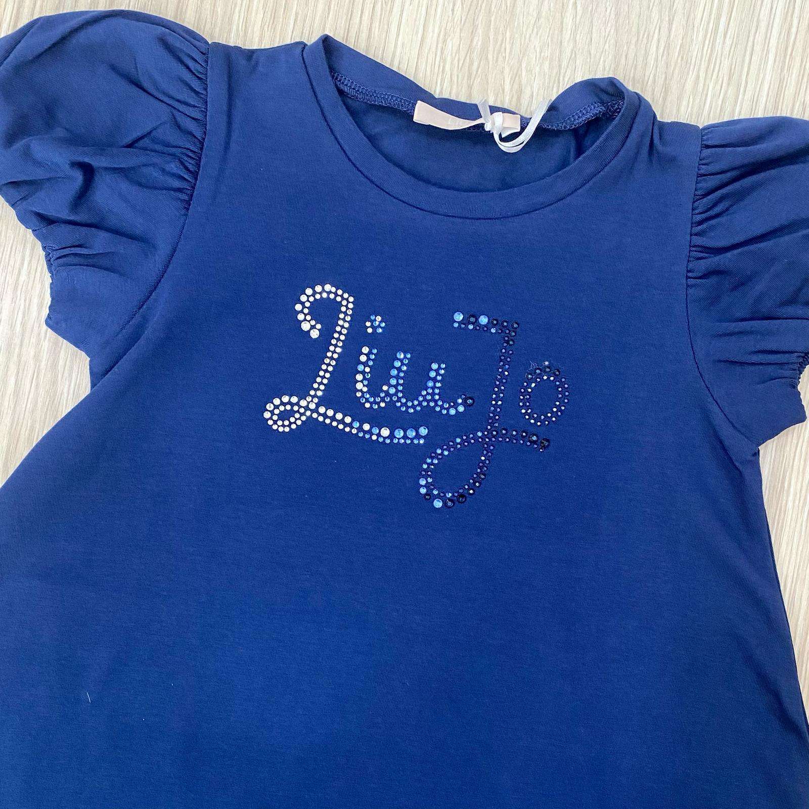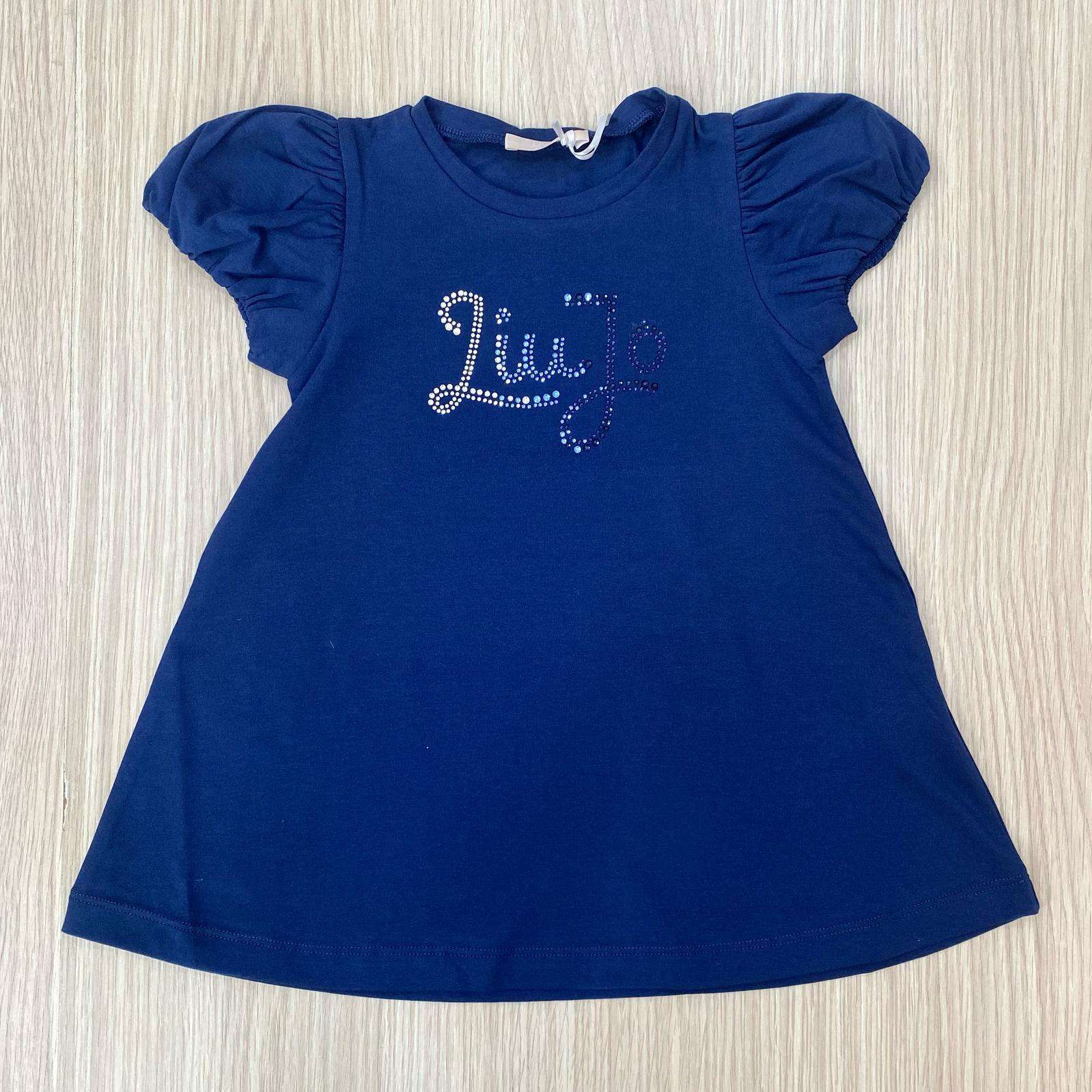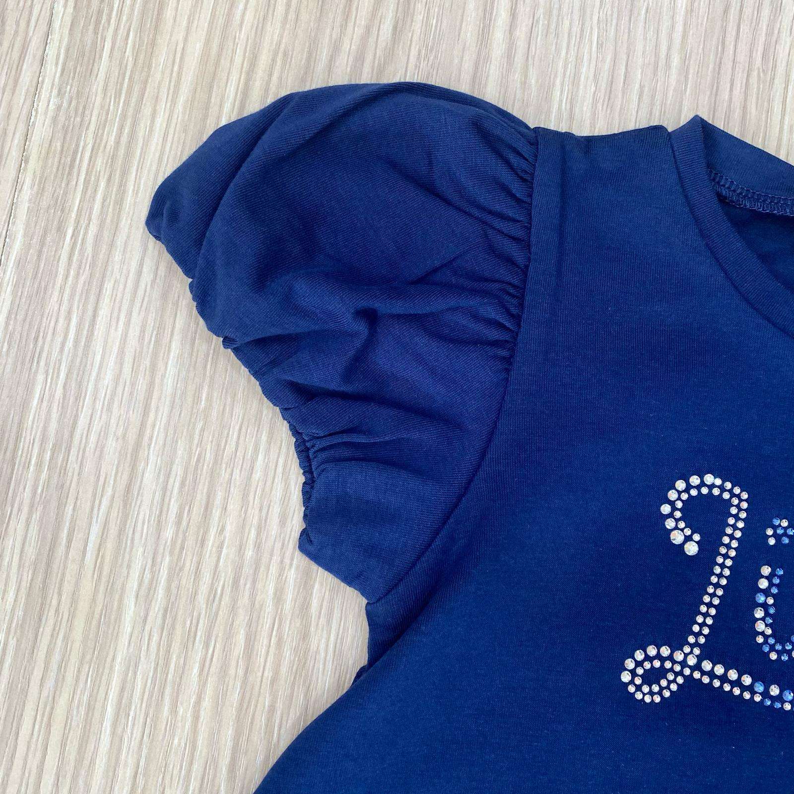 Vestitino bambina in cotone, di colore blu, con applicazione di strass, con dettaglio di manica arricciata con elastico. 95% Cotone. 5% Elastane.
