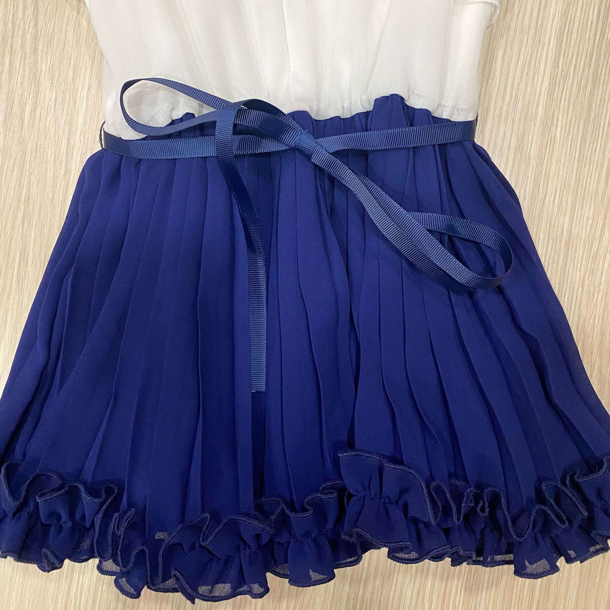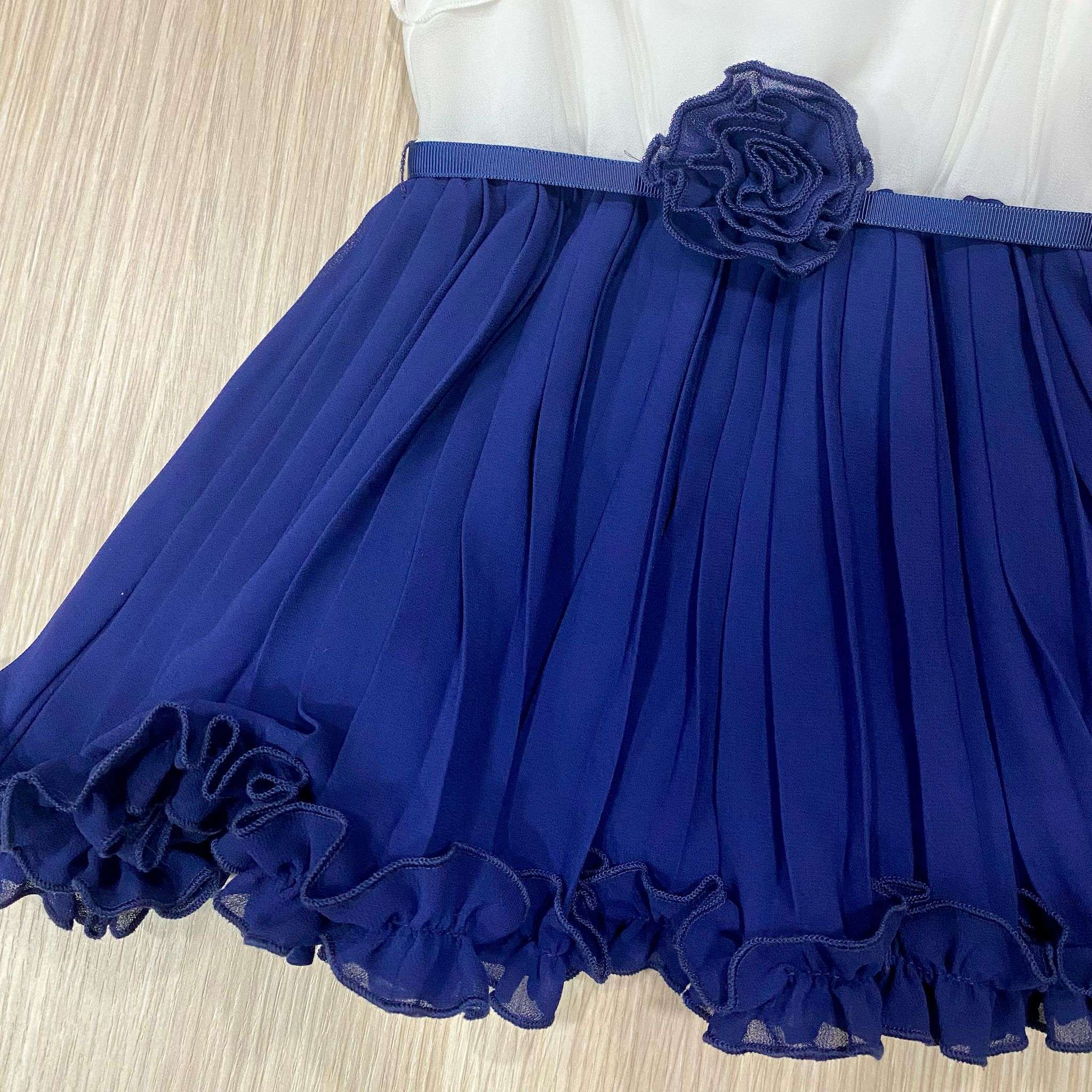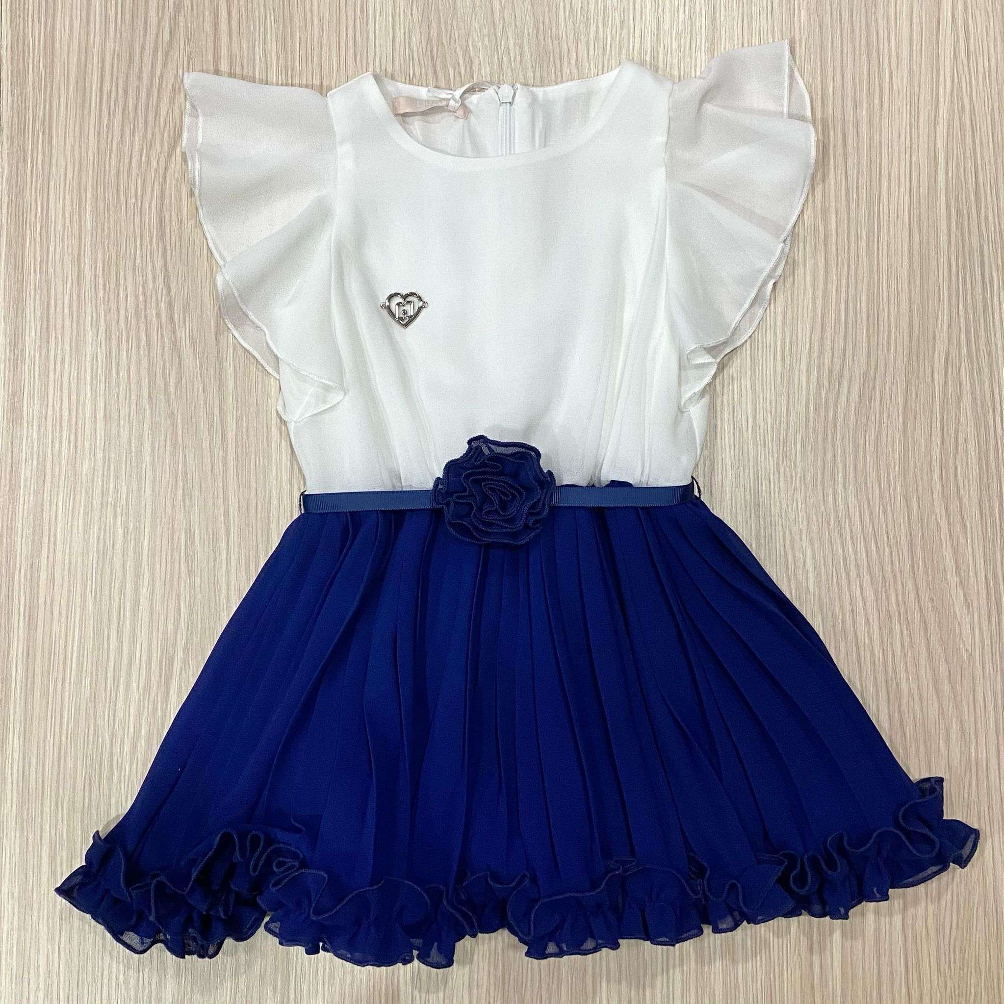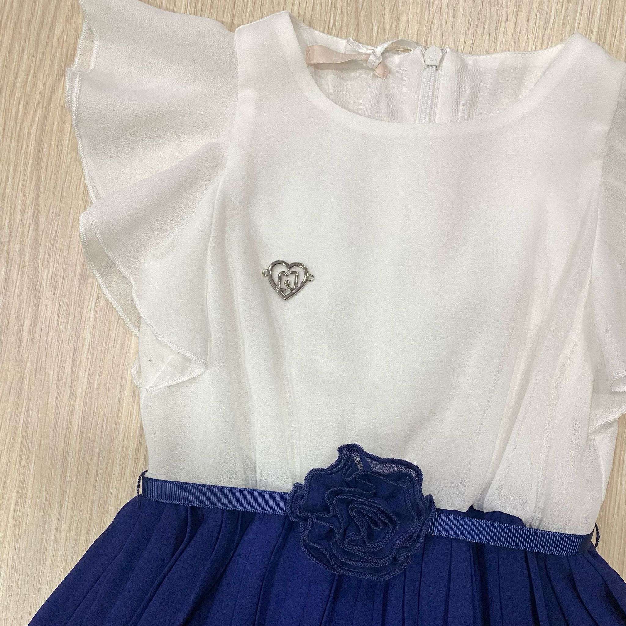 Vestitino elegante bambina in viscosa, di colore bianco e blu, con corpetto applicazione logo LIU•JO, manichina con voilant, chiusura con cerniera. Parte infeririore con gonnellina plissetatta, con fodera in cotone. 100% Viscosa.