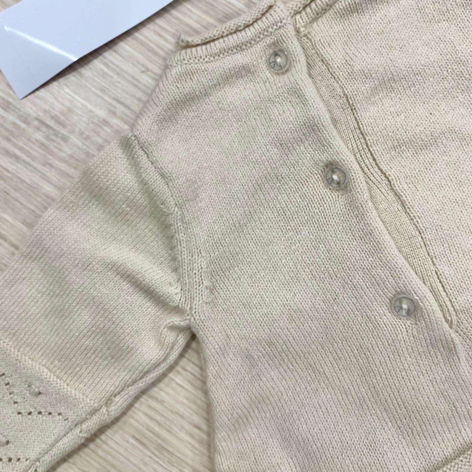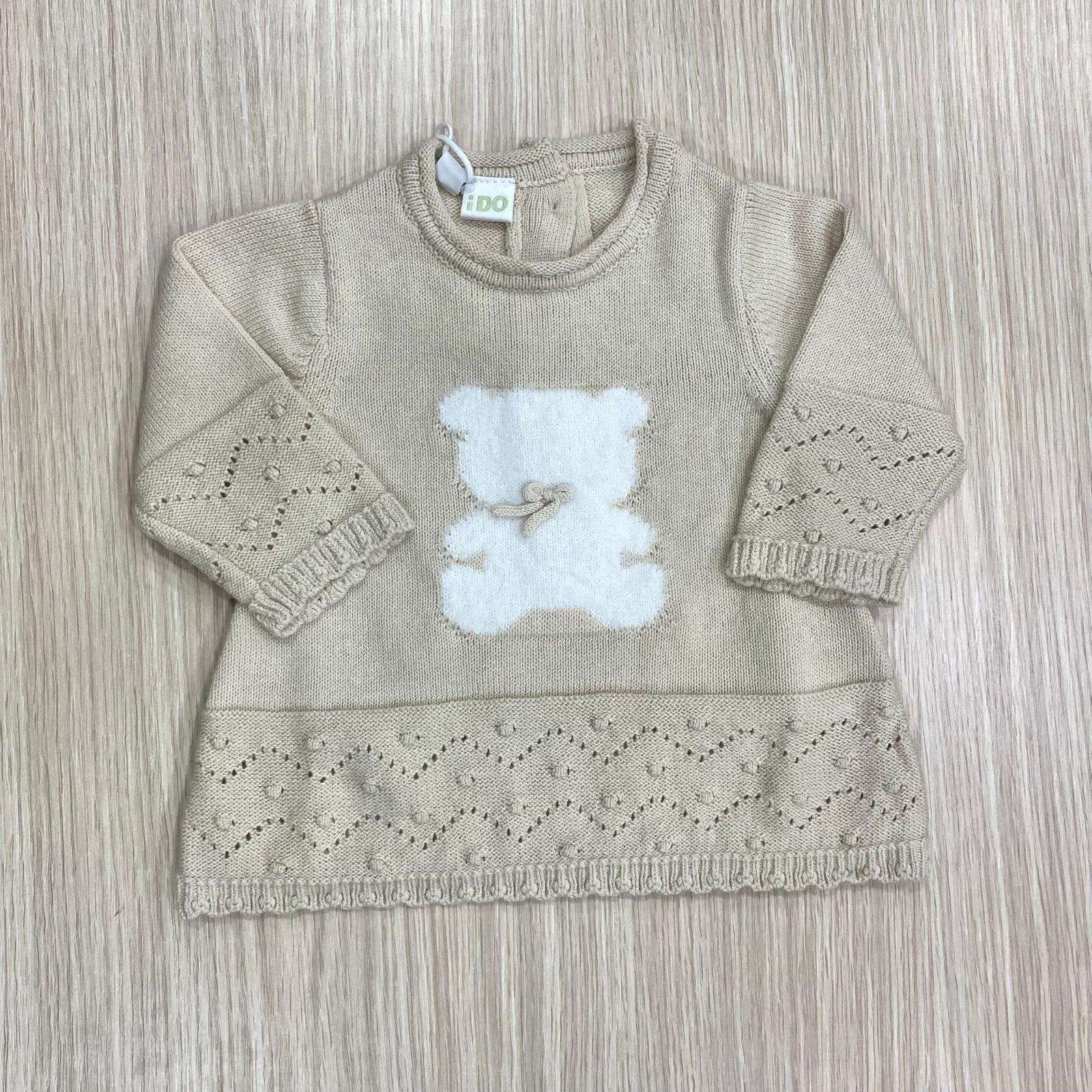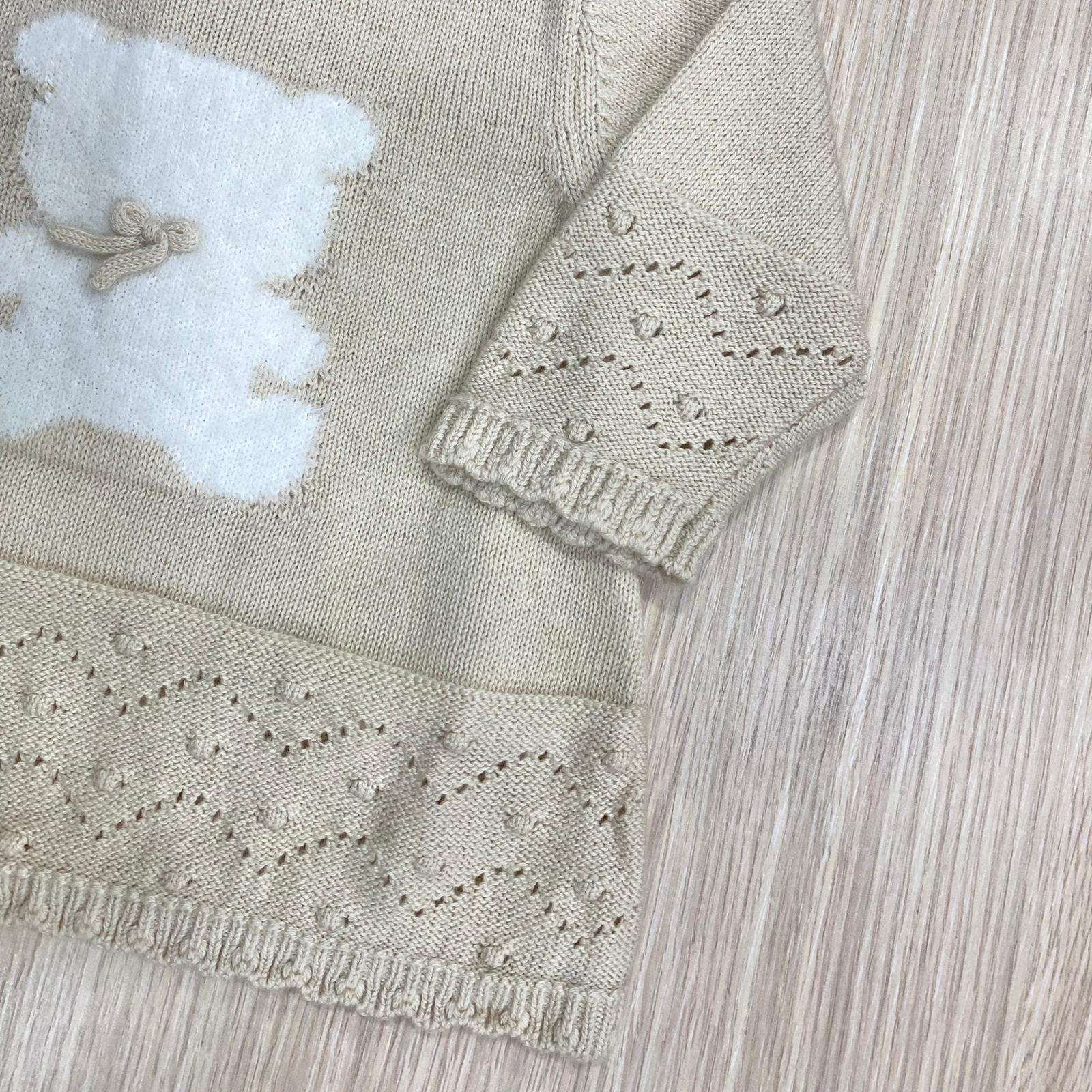 Vestitino neonata/bambina lavorato in maglia, in caldo cotone misto lana, di colore ecrù, con disegno teddy di colore bianco. 80% Cotone. 20% Lana.