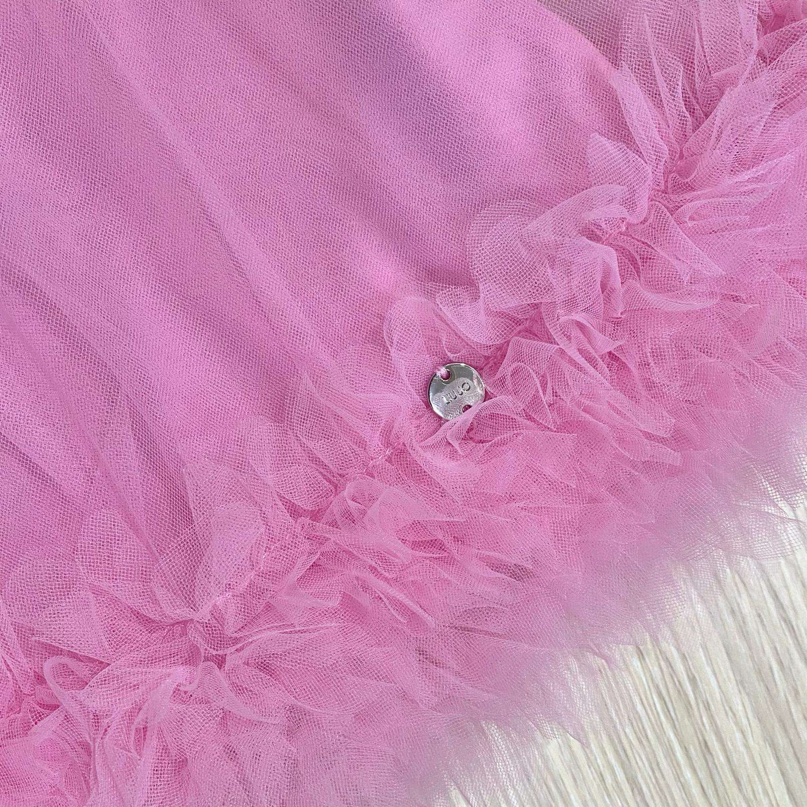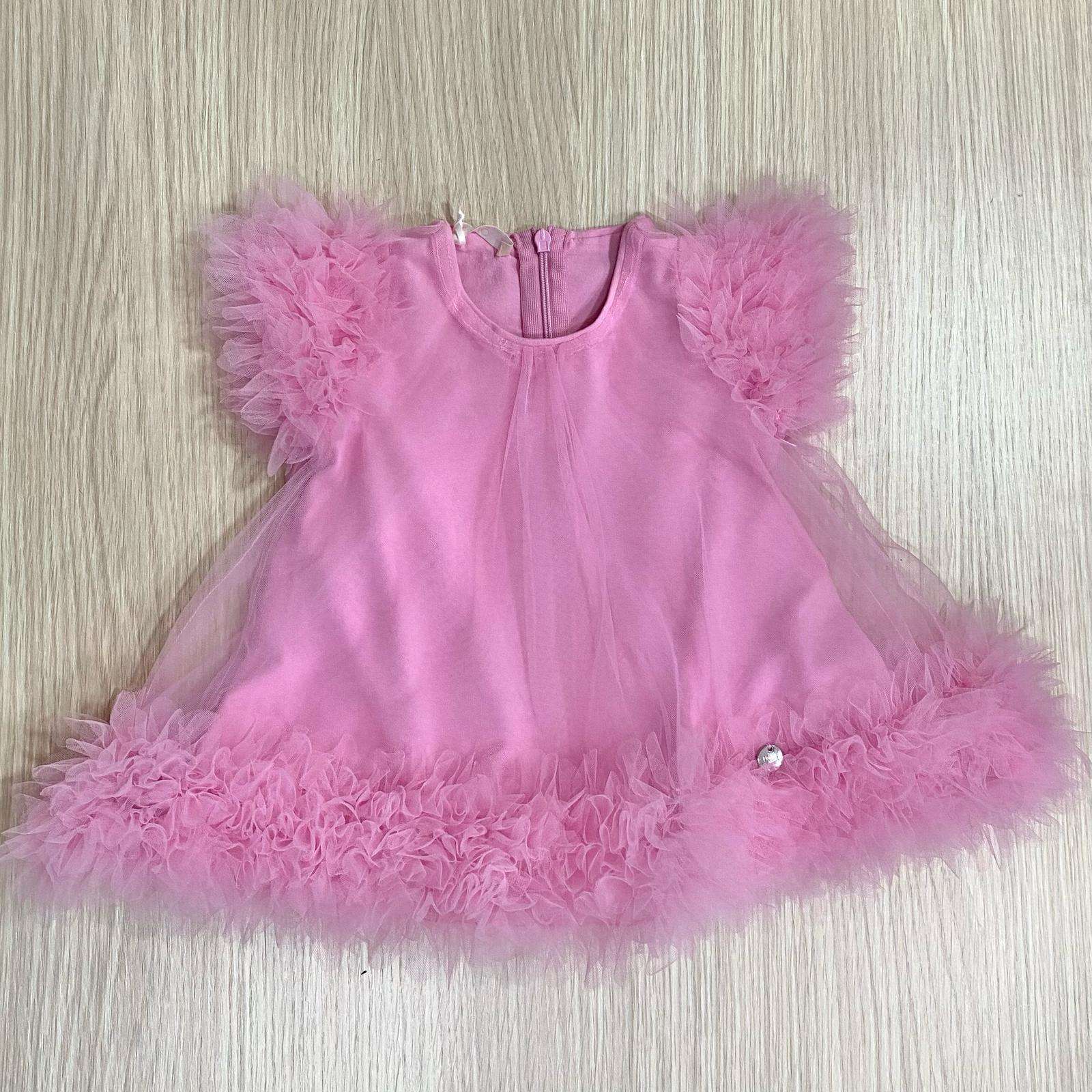 Vestitino neonata/bambina in cotone, di colore rosa, con balze in tulle drappeggiato. Vestitino con tulle, apertura con cerniera. 100% Nylon.