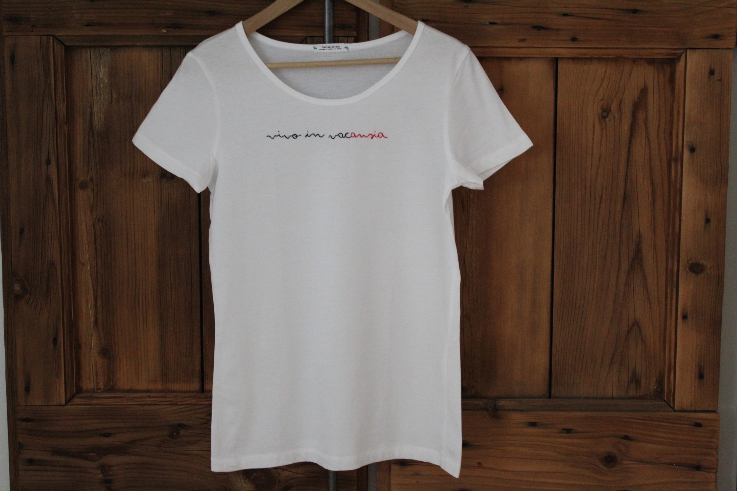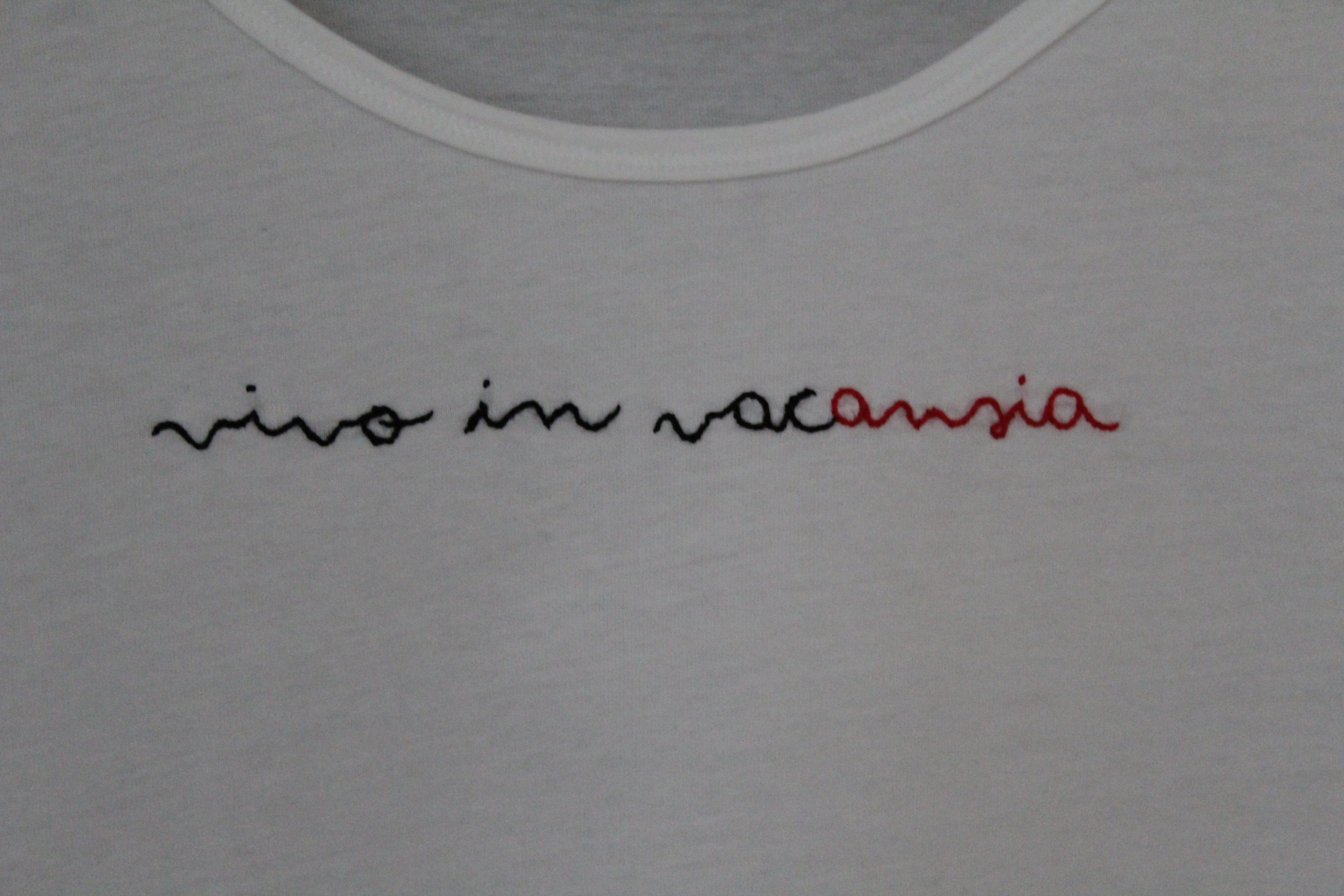 T-shirt “VIVO IN VACANSIA” ricamata a mano. La foto è puramente illustrativa, il modello utilizzato ora è quello in cotone BIO (vedi tabella TAGLIE in galleria foto)